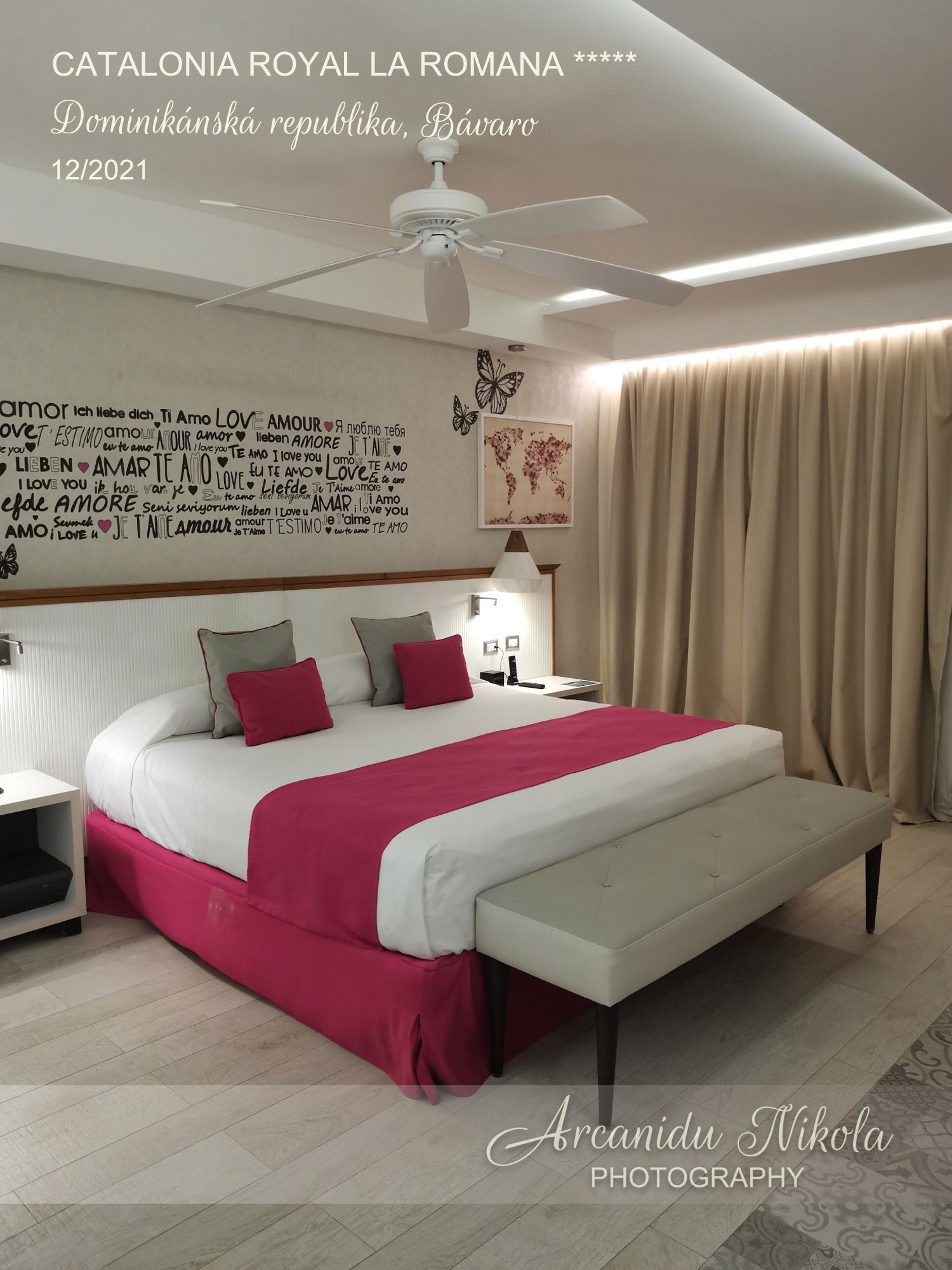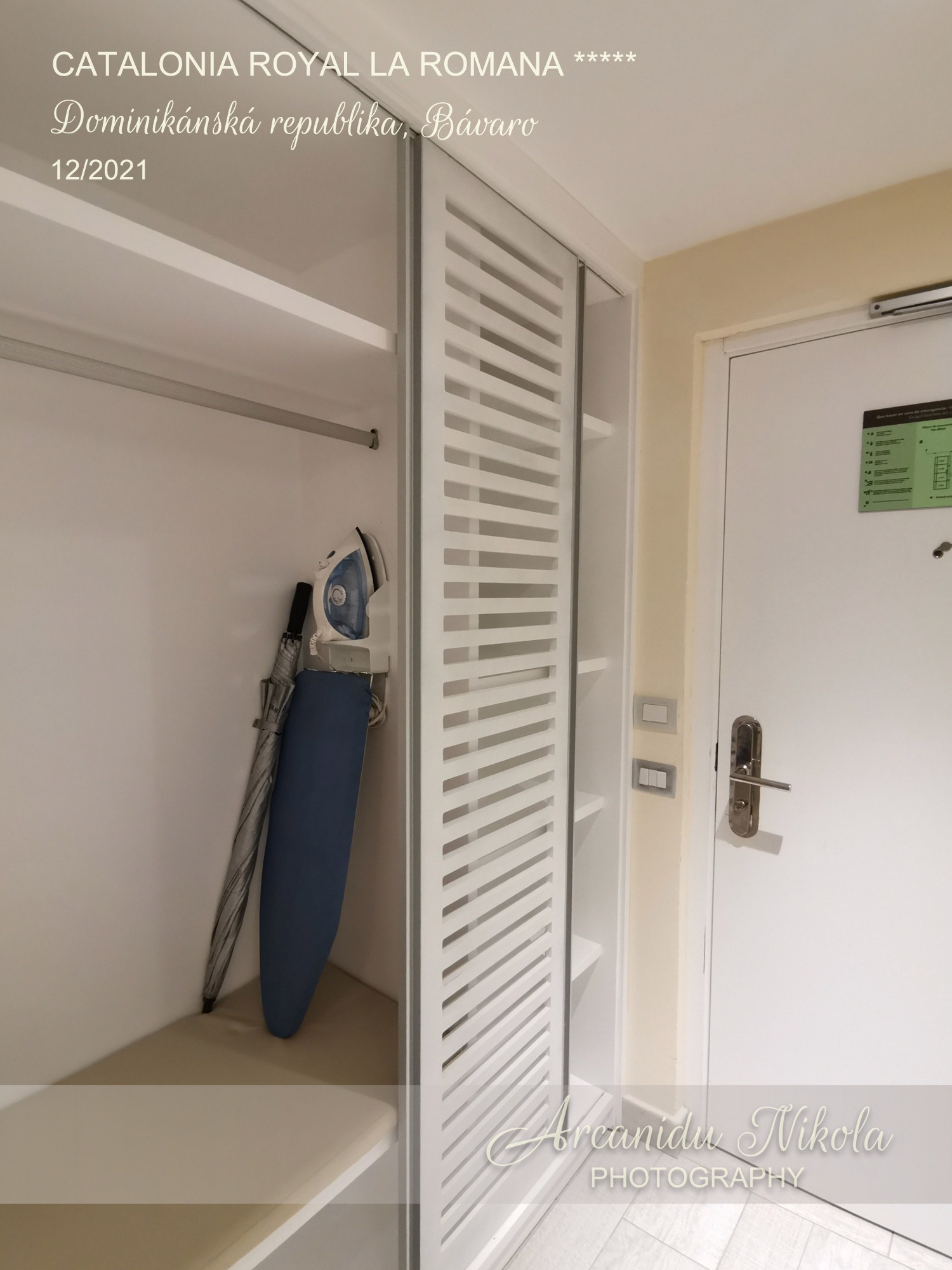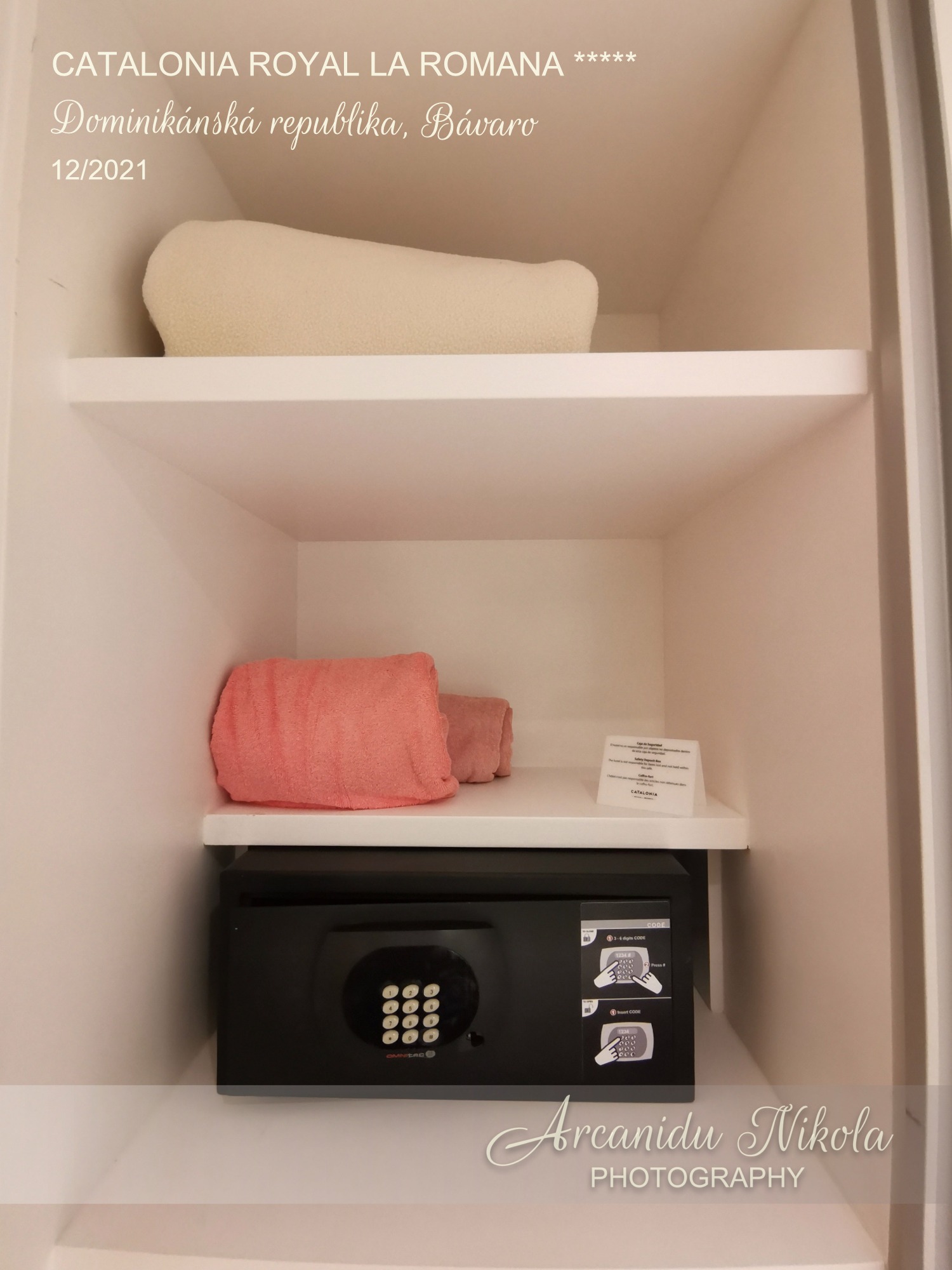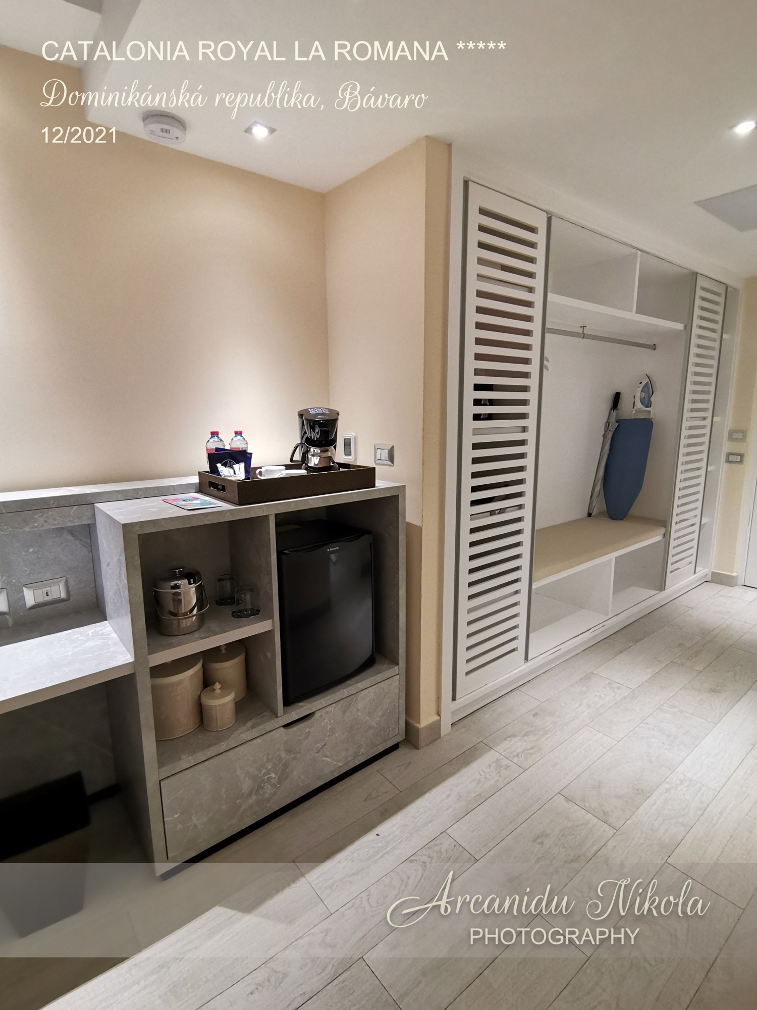 Pokoj je překrásný. Ve skříni jsou župany s papučemi, žehlička a prkno, deštník, trezor, osušky na pláž a deka. Pomůcky na přípravu kávy, minibar s pitím. TV. Nad postelí velký stropní větrák, samozřejmě v pokoji je i klimatizace.