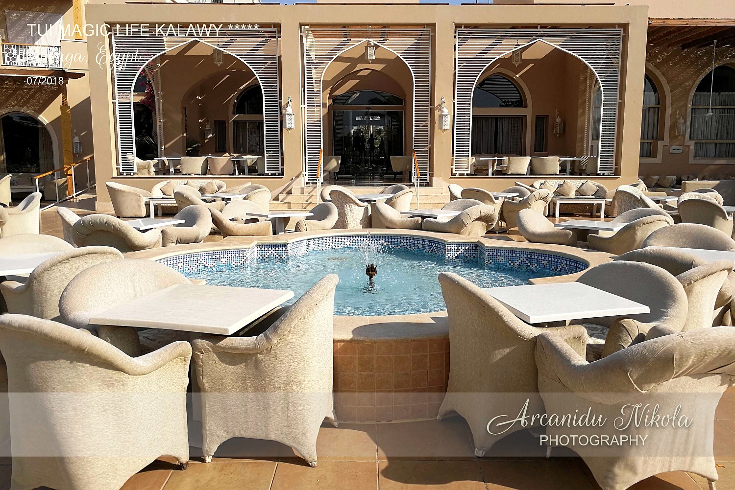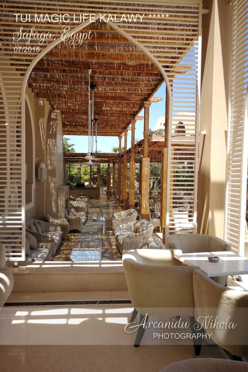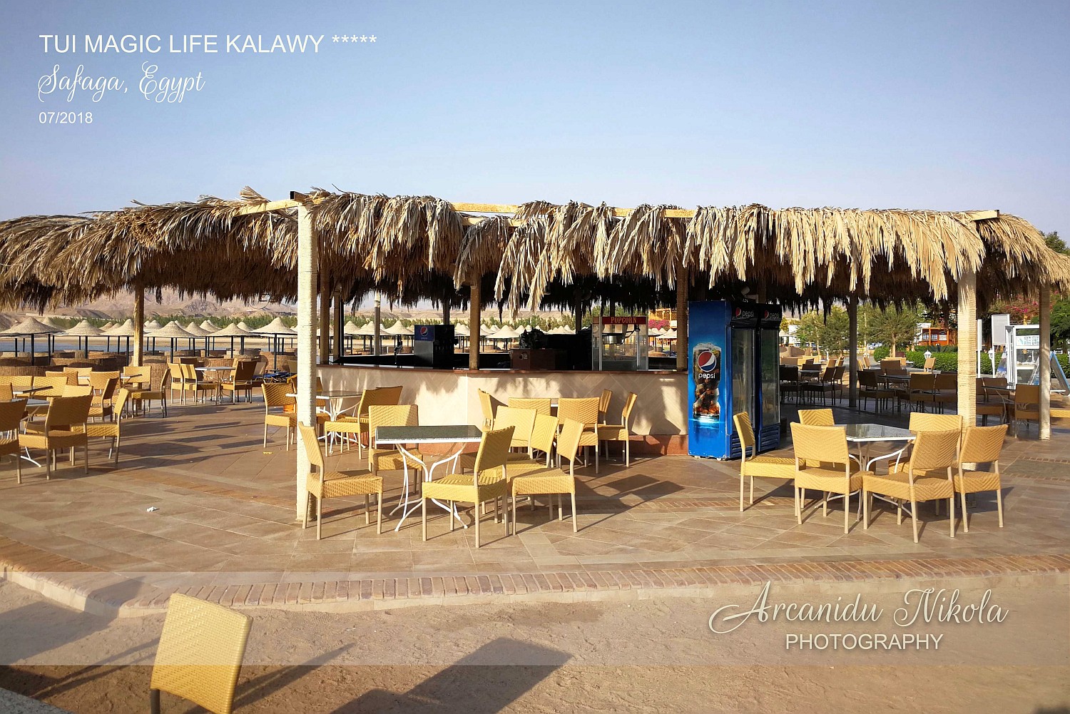 Restaurace je vkusně umístěna nad bazénem a je zde i výhled na moře. Uvnitř příjemná klimatizace a venku množství větráků nad hlavami.