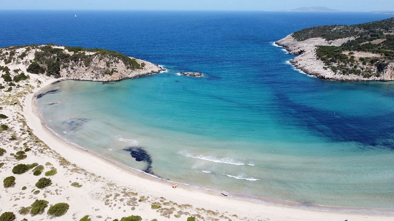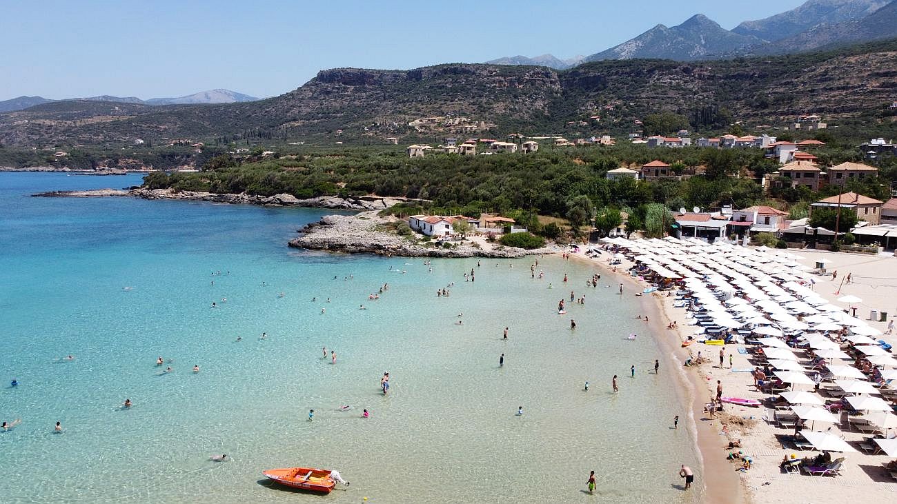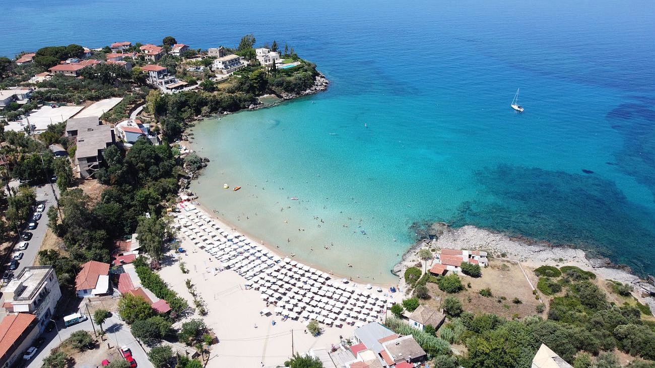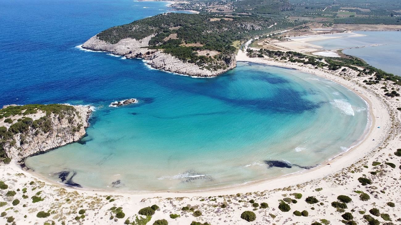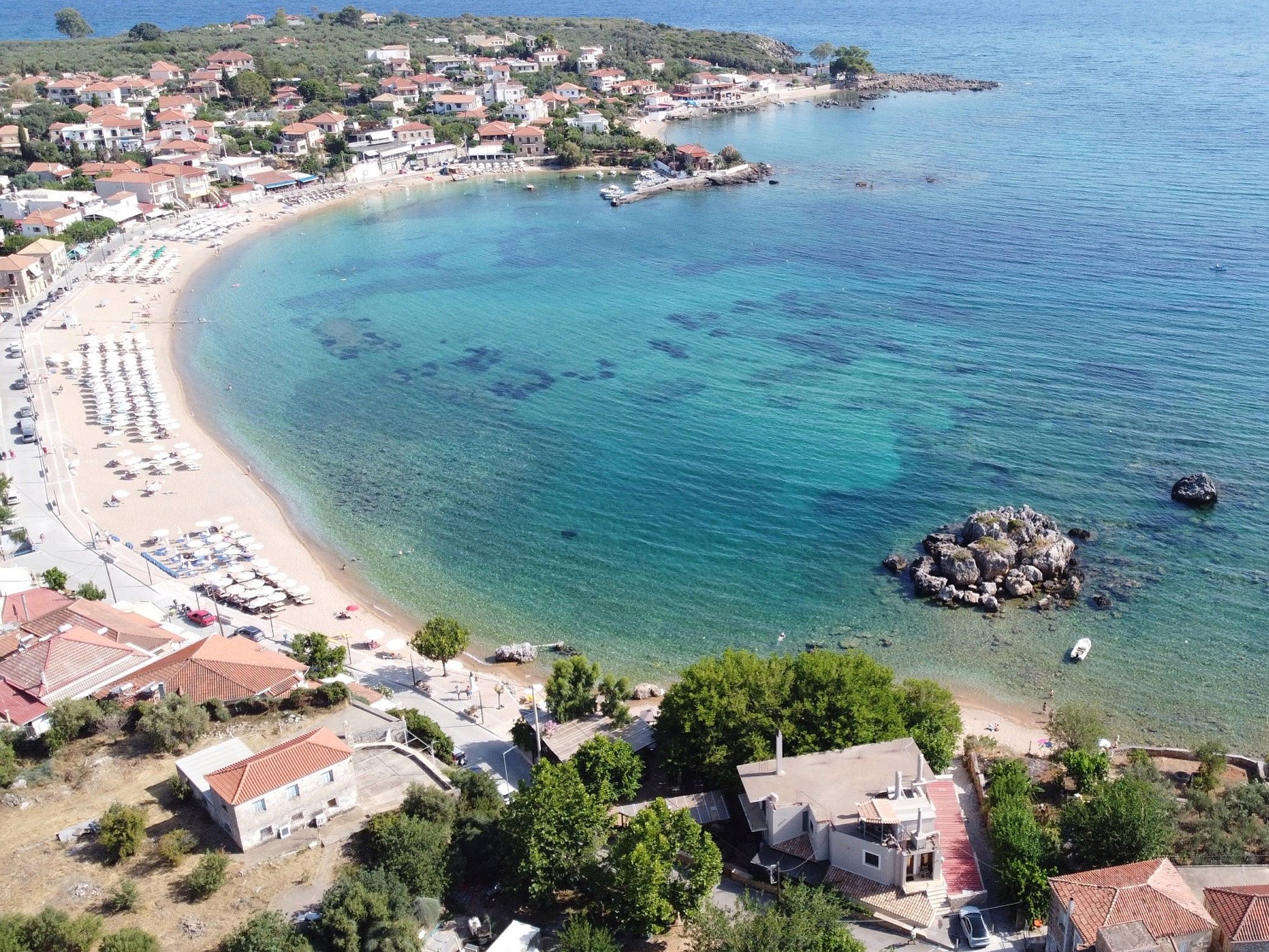 Pláž Kalogria Je to malá zátoka s křišťálově tyrkysovou vodou a světlým velmi jemným pískem. Vstup do vody je velmi pozvolný. Pláž je v sezóně velmi přeplněná, hlídaná plavčíkem.