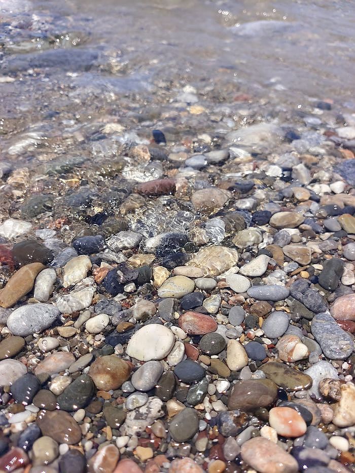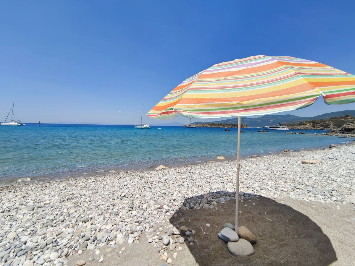 oblázky - spíš kameny různých velikostí, proto doporučuji nosit obuv do vody. V sezóně, o víkendu a odpoledne je to velmi přeplněné místo. V zadní části pláže je malá taverna, která prodává jídlo a pití za rozumné