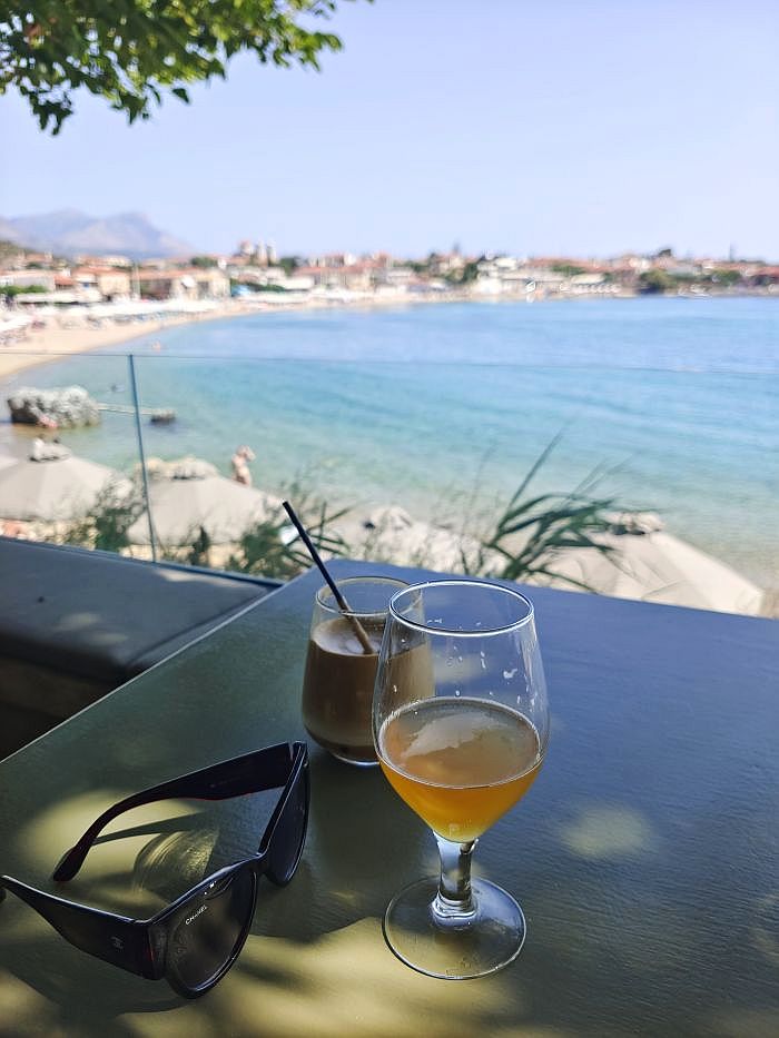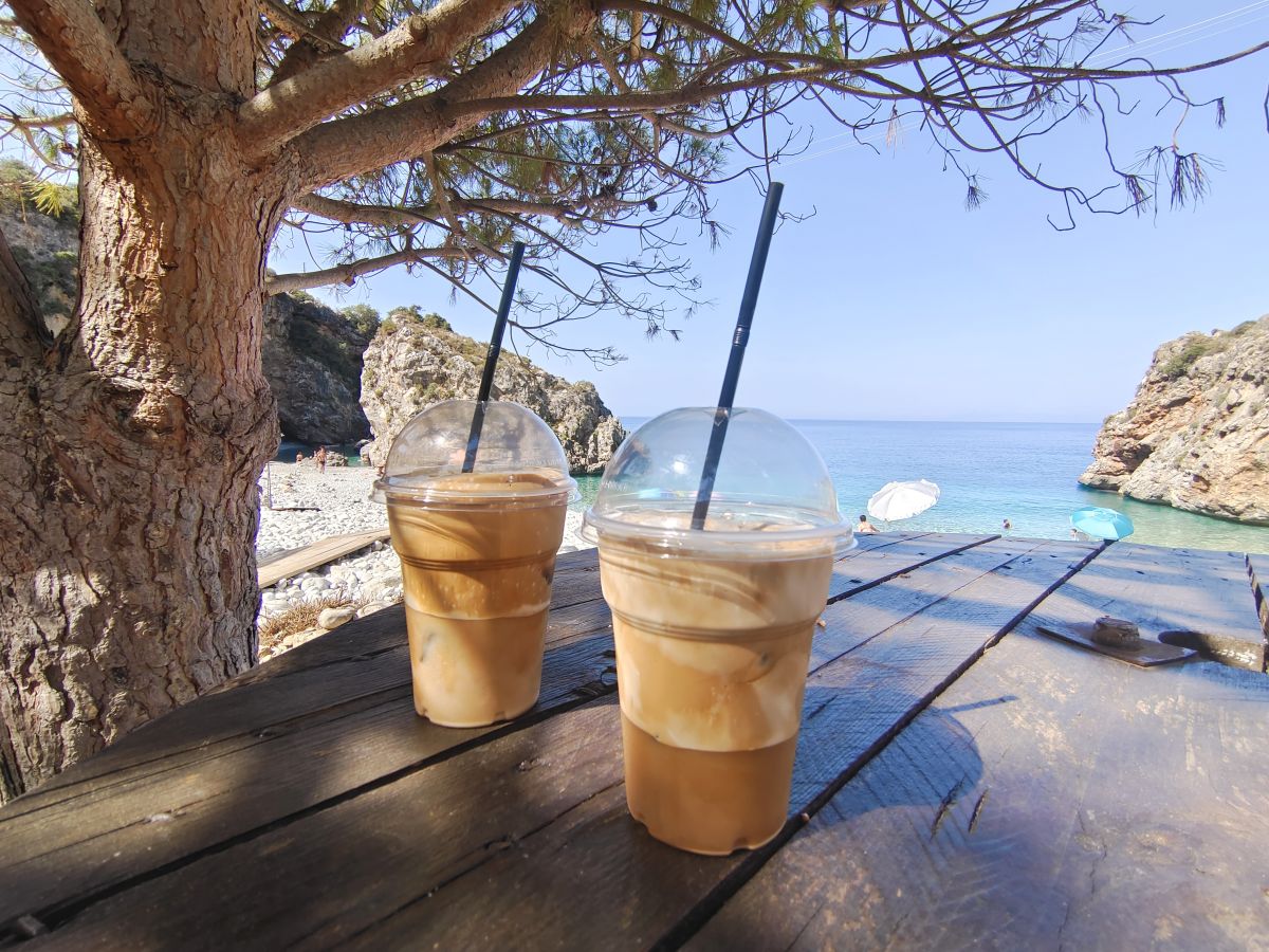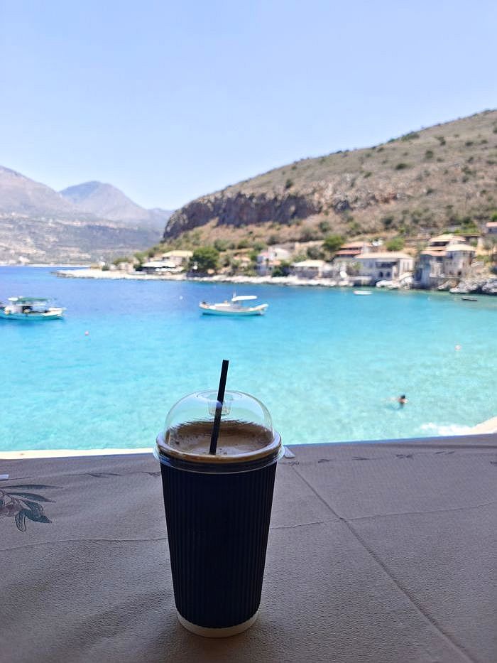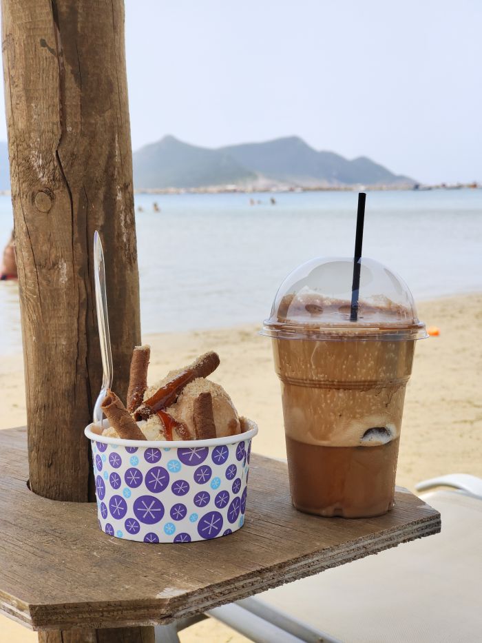 V restauraci Thodora's Place, ze které jsem koukala na pláž, jsem si za neskutečných 2,50 € koupila výborné frappe. Doporučuji.
