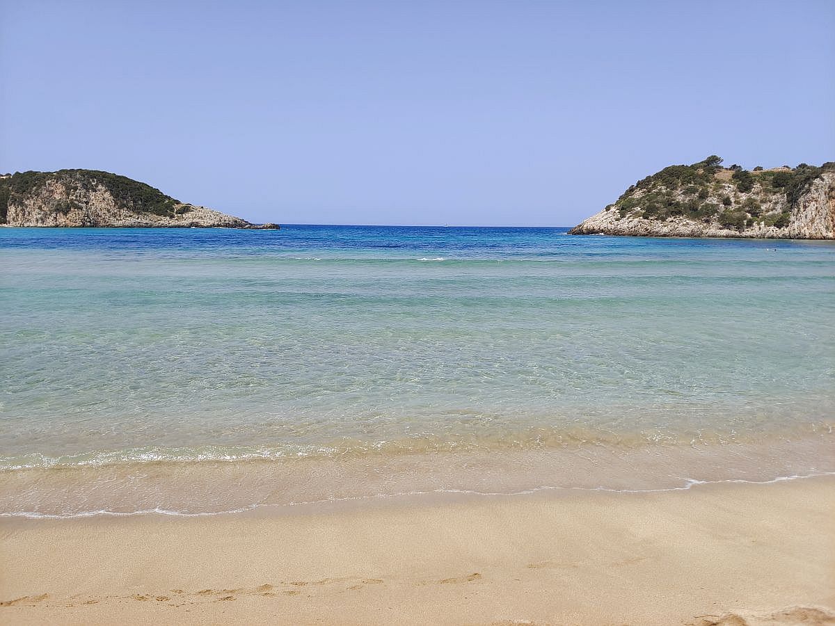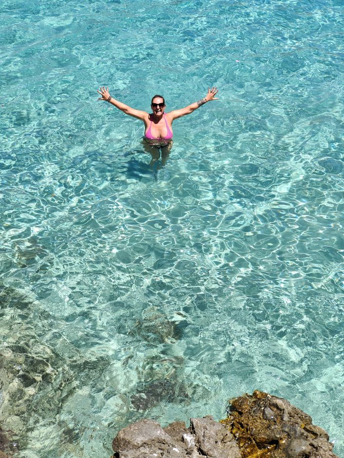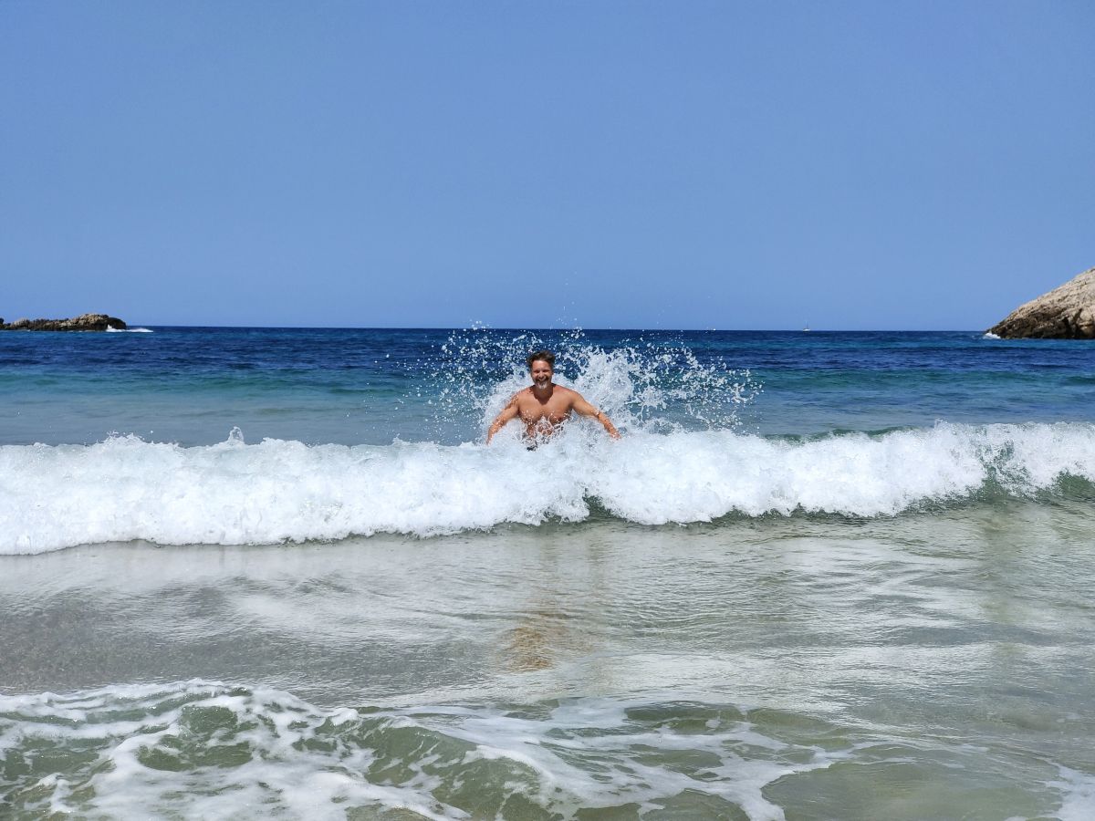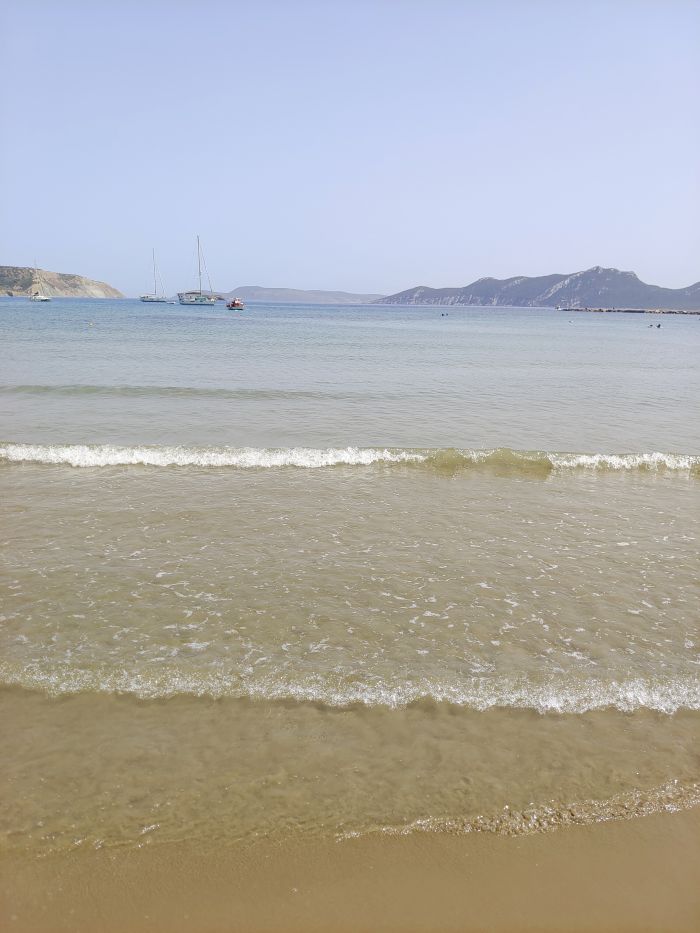 Je to prostorná zátoka s křišťálově tyrkysovou vodou a čistým světle zlatým jemným pískem. My jsme sem přijeli v den, kdy byl silnější vítr, a tak jsem ten jemný písek měla v jídle, zubech, vlasech, prostě všude :-D.