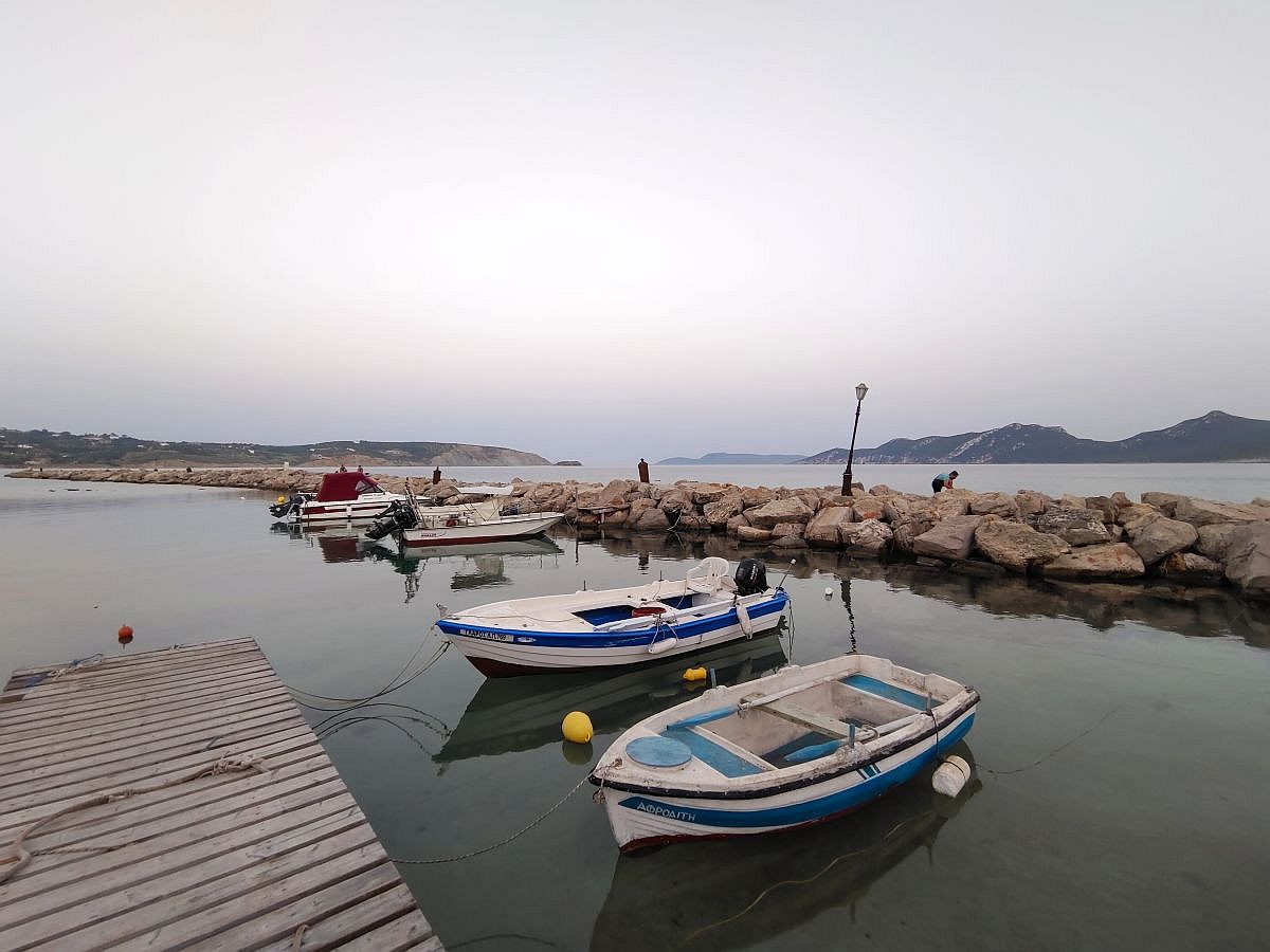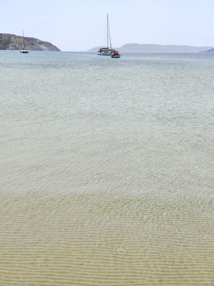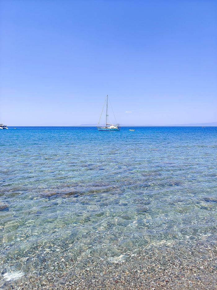 Příjemnou a překvapivou vlastností vody v Kalogrii jsou studené proudy. Hodnotíme ji oproti předchozím dnům jako pláž s chladnější vodou, ale nám to právě vyhovovalo.