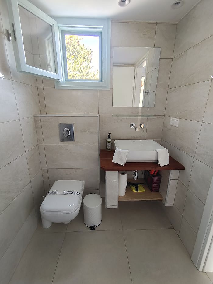 Koupelna se sprchou je vybavená potřebnými pomůckami, připravený byl pro nás sprchový gel a šampon, olivové tekuté mýdlo na ruce (vše ECO friendly), k dispozici byl fén, WC papír, ručníky a osušky.