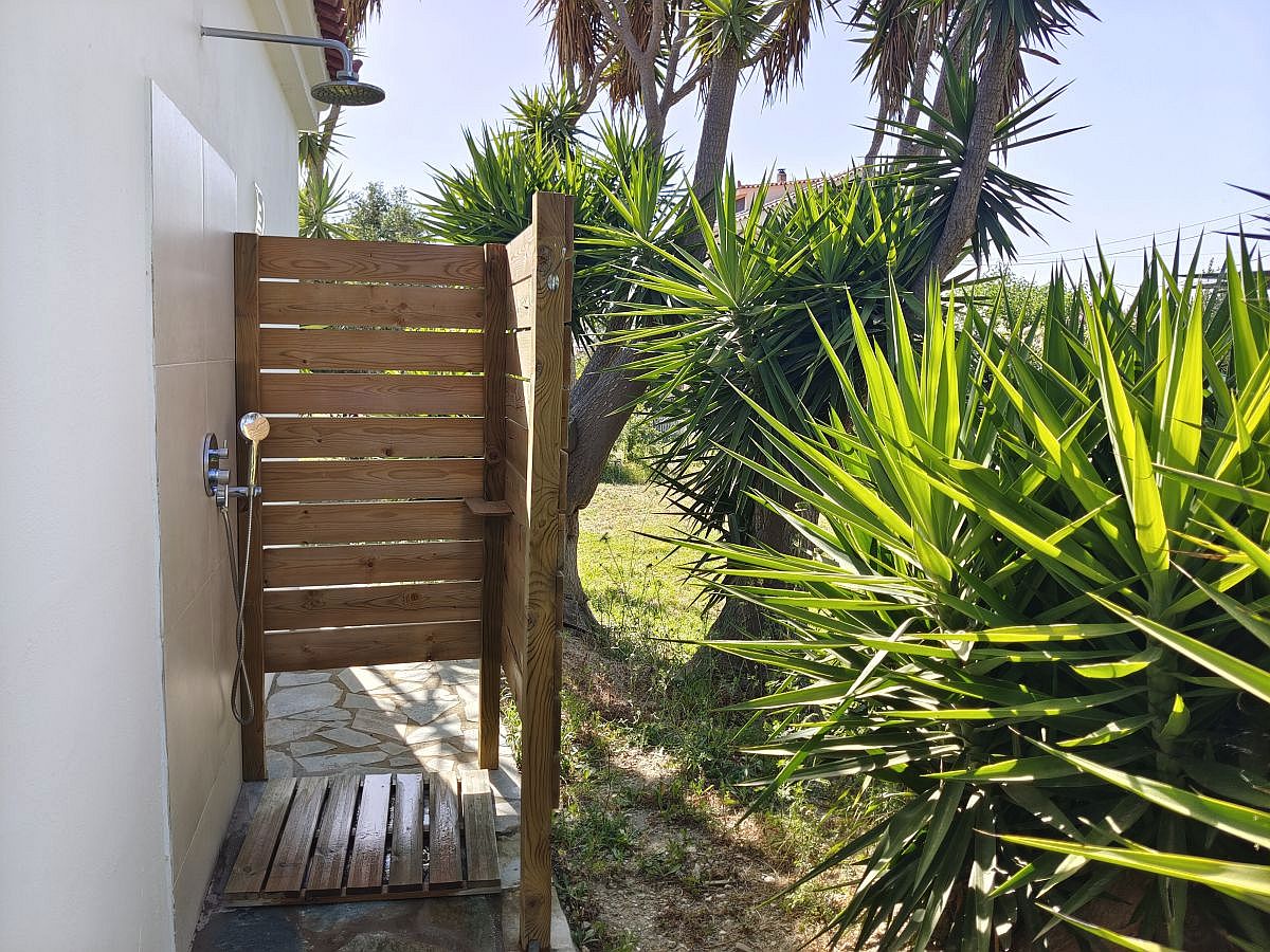 Na terase je také houpačka a šňůra na prádlo s dřevěnými kolíky, za domečkem je venkovní sprcha (vyzkoušela jsem, paráda). Dřevěné jsou všechny židle a stoly, které tu jsou, včetně již zmíněného gauče.