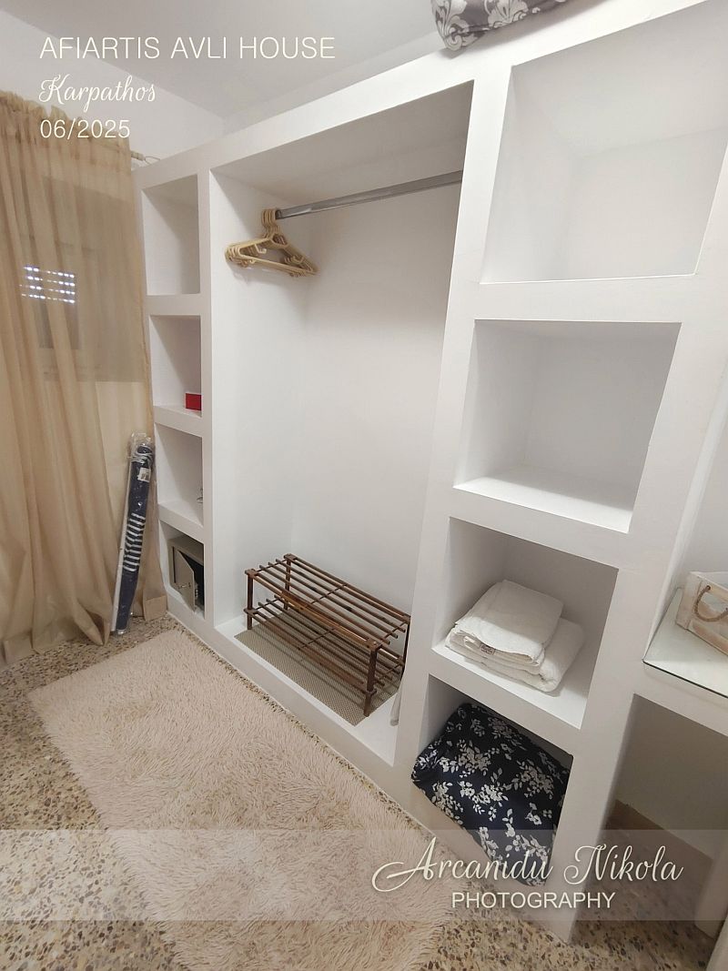 Trezor, žehlička a malé prkno na žehlení. Malá otevřená skříň s věšáky. Klimatizace, TV a bezplatná WiFi.