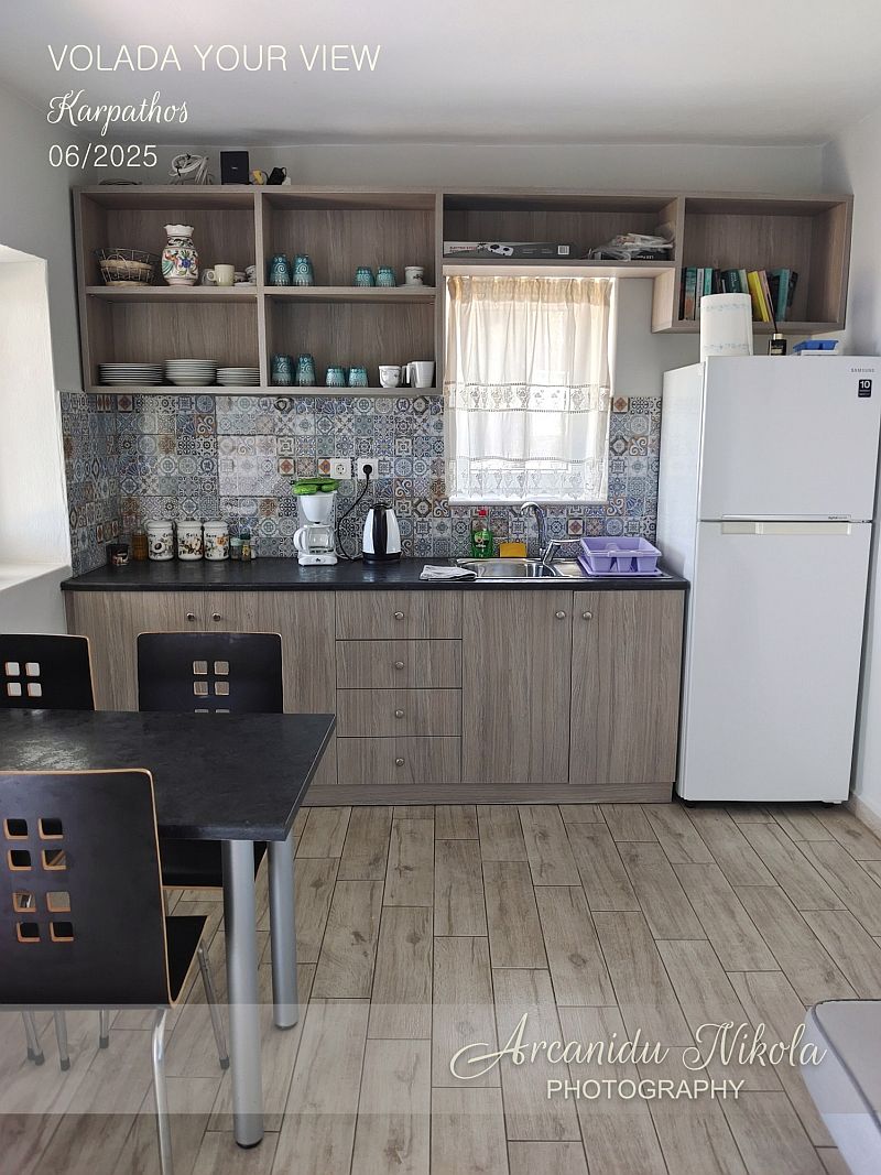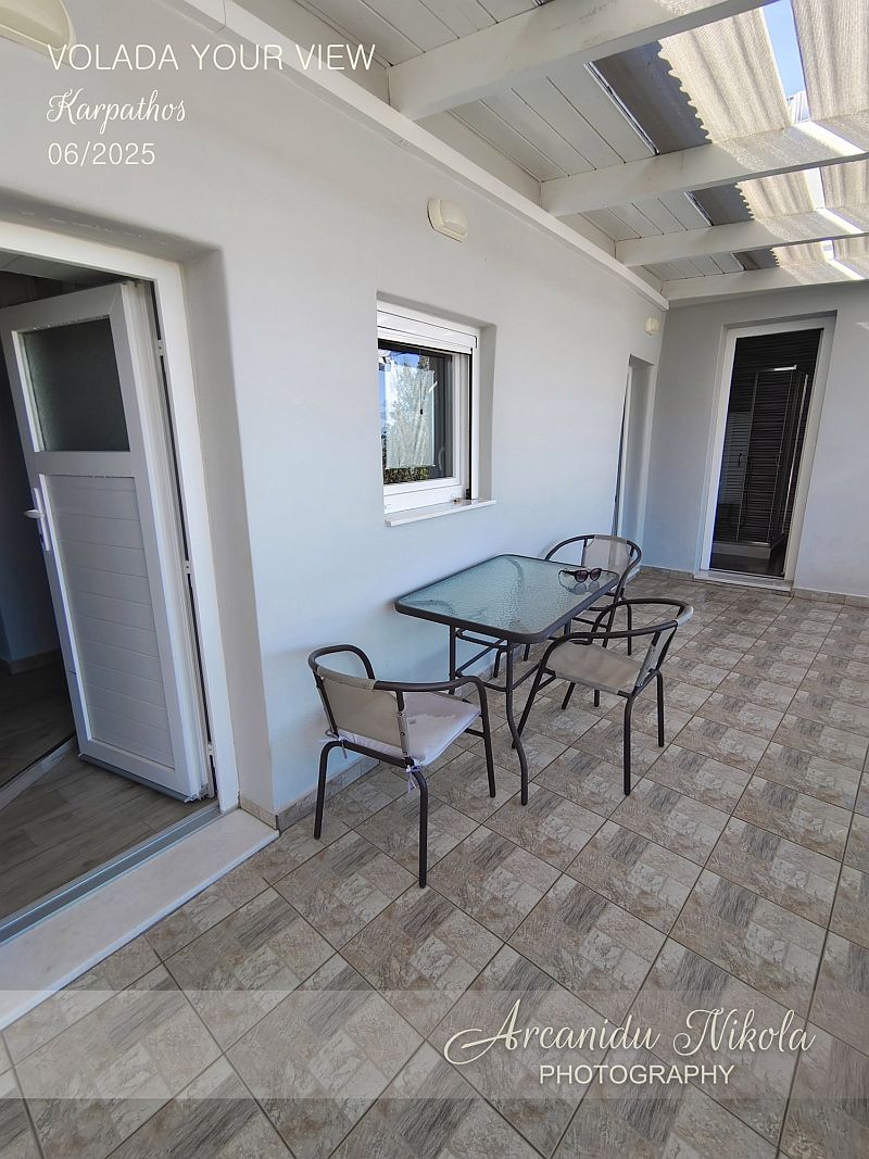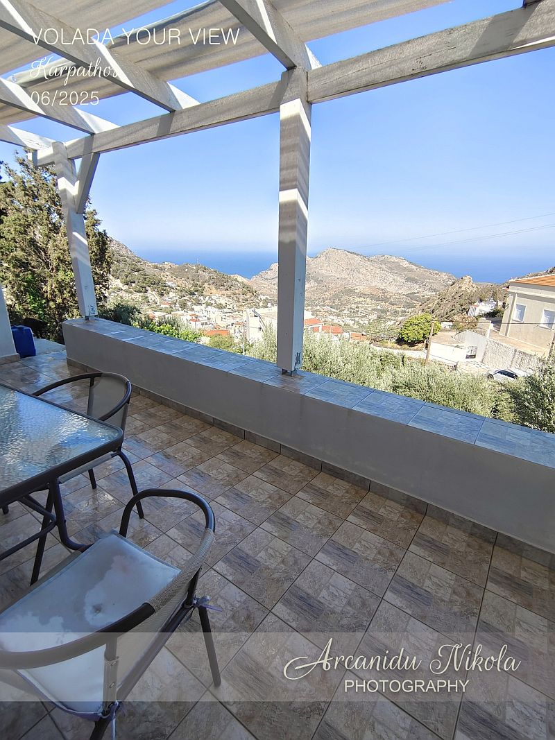 Dům má velkou terasu, ze které je krásný výhled na hory, moře a celou vesnici. Terasa je místo vhodné pro krásné snídaně, večeře, odpočinek, relax. Nejlepší je zde sedět u východu slunce. Díky lokalitě je zde klid.