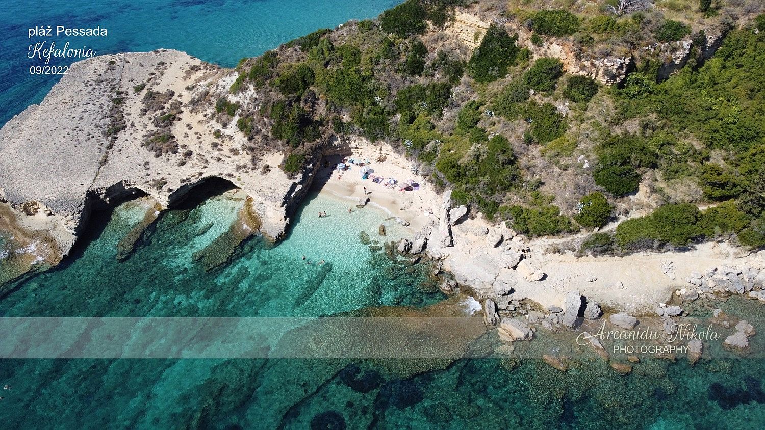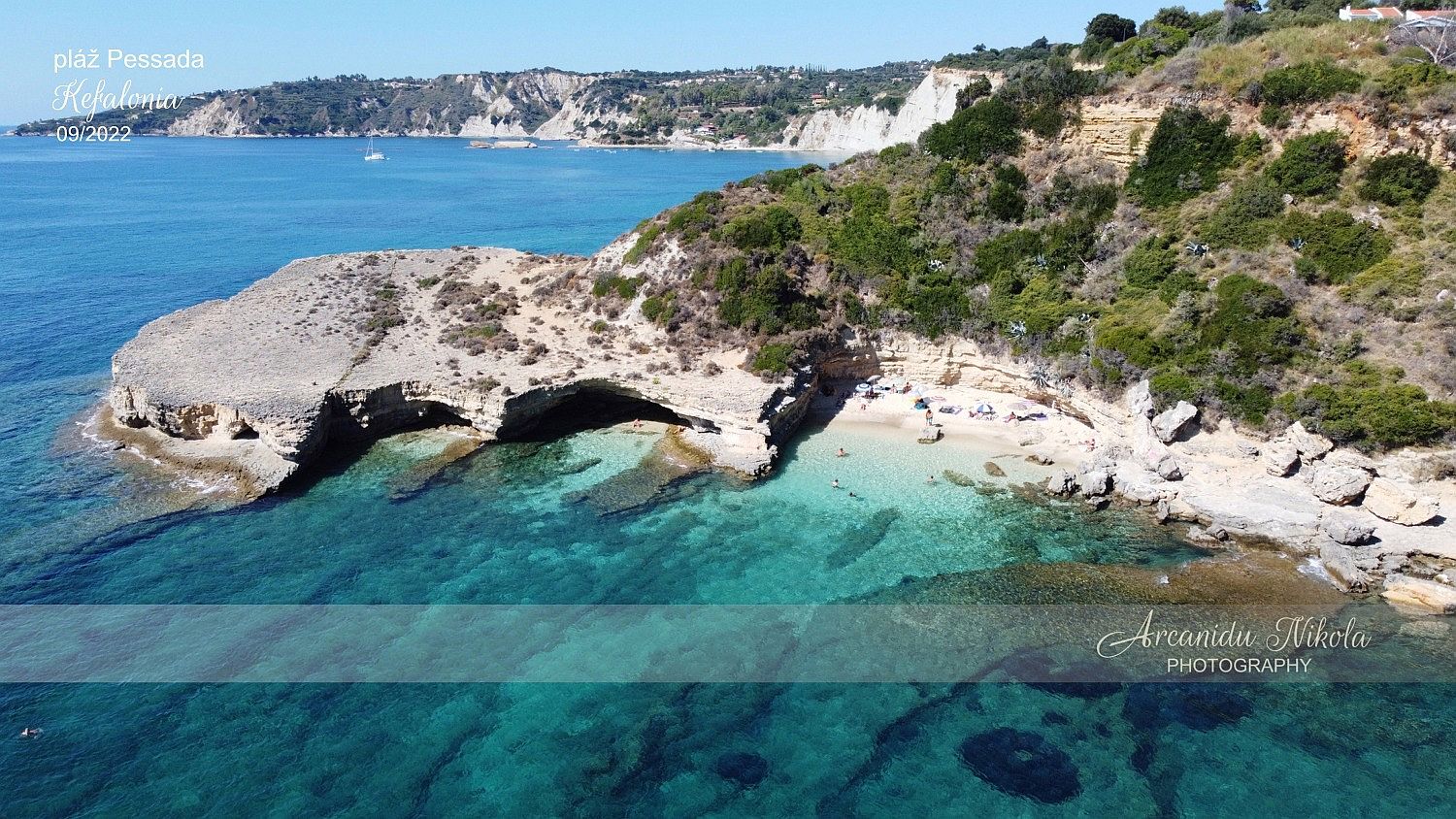 jeskyně na tomto místě najdete také krásné sluncem zalité jezero, které protíná oblast zříceného lomu v důsledku zemětřesení, které postihlo Kefalonii v roce 1953.
