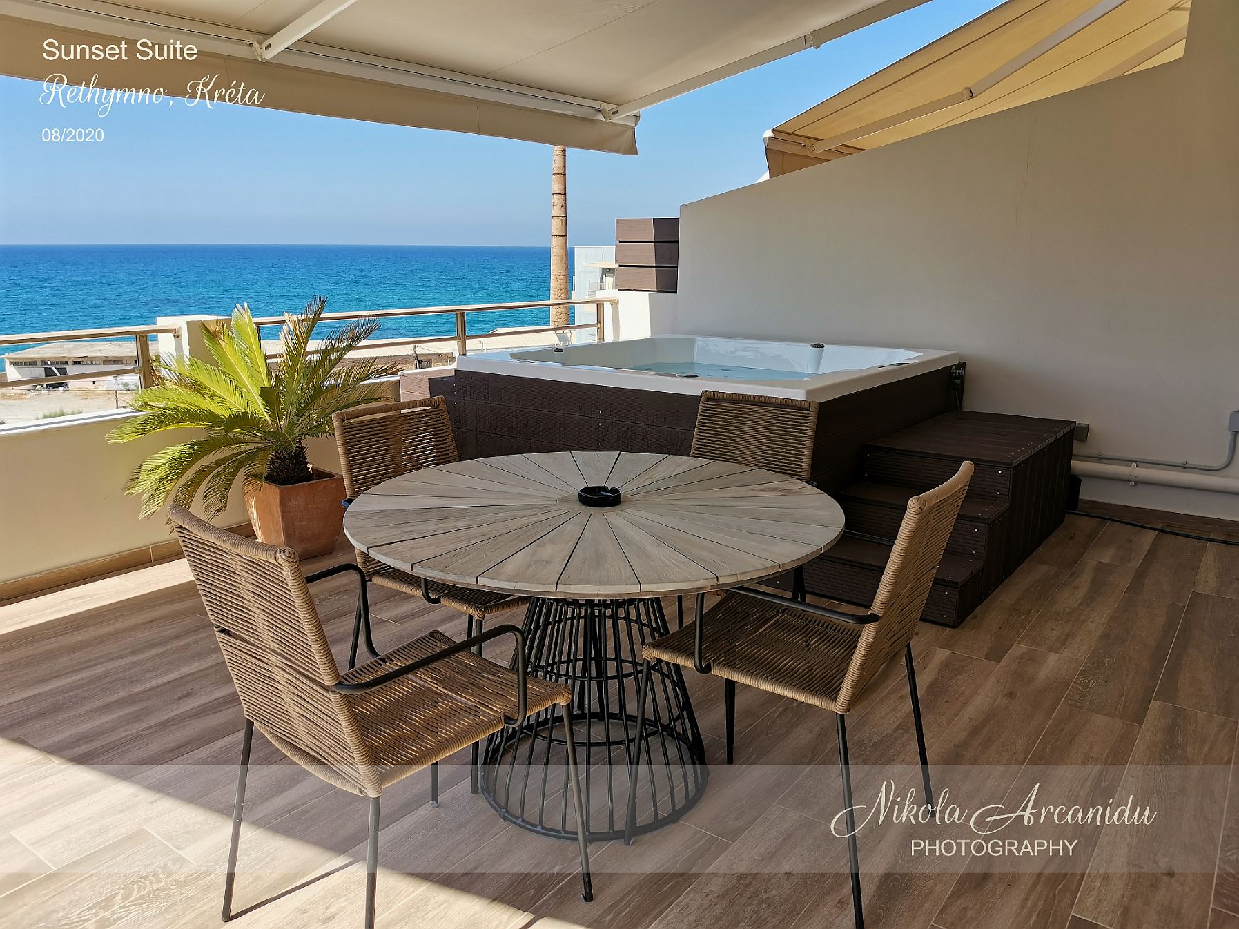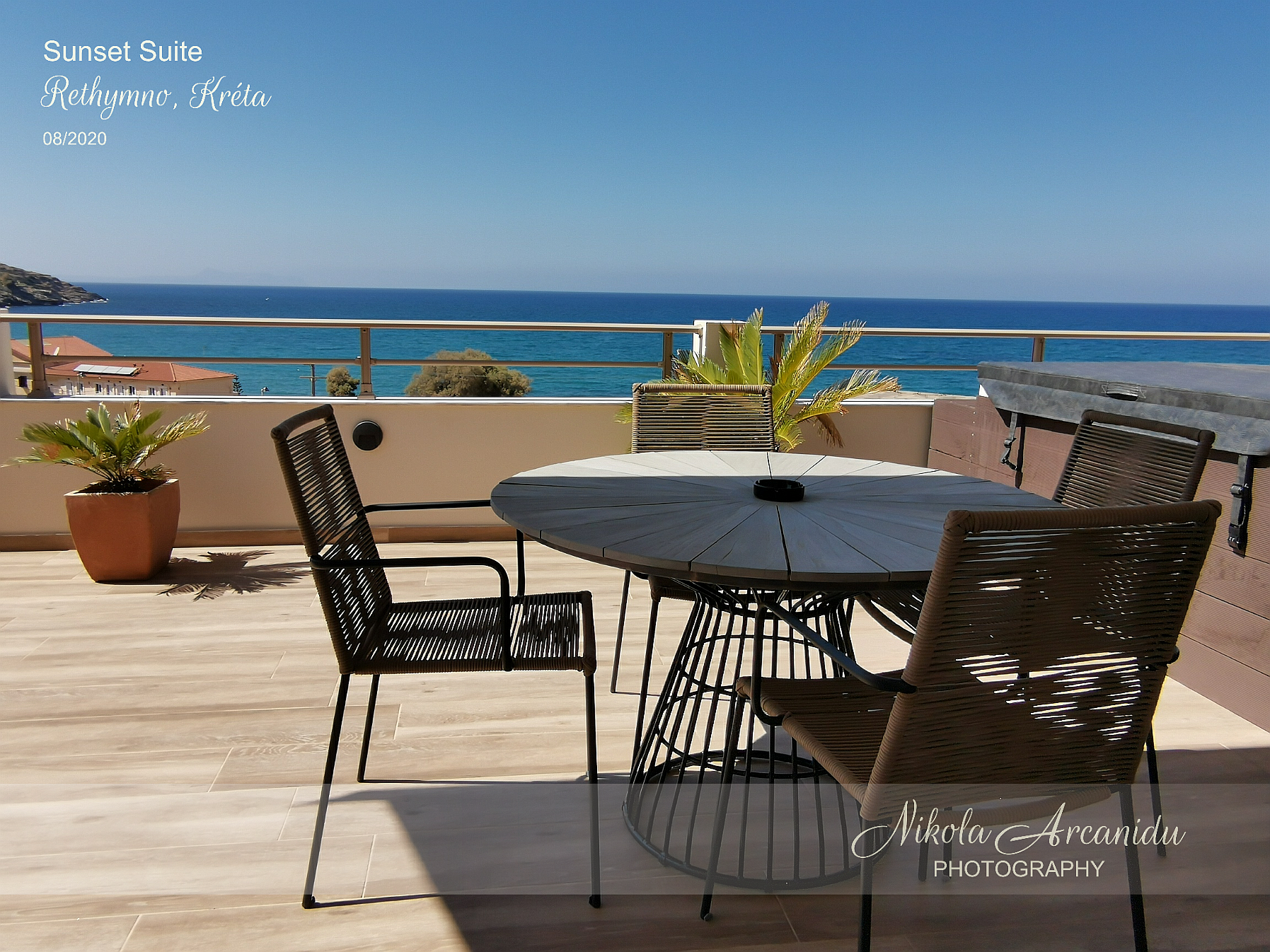 Byt je moderní, prakticky vybavený, má i velkou terasu, kde je krásné sezení - stůl se 4 židlemi, několik měkkých křesel, jedno velké kulaté křeslo, sušák prádla a jacuzzi. Z terasy je výhled na moře, ale jsou zde slyšet auta - pod bytem nedaleko je silnice,