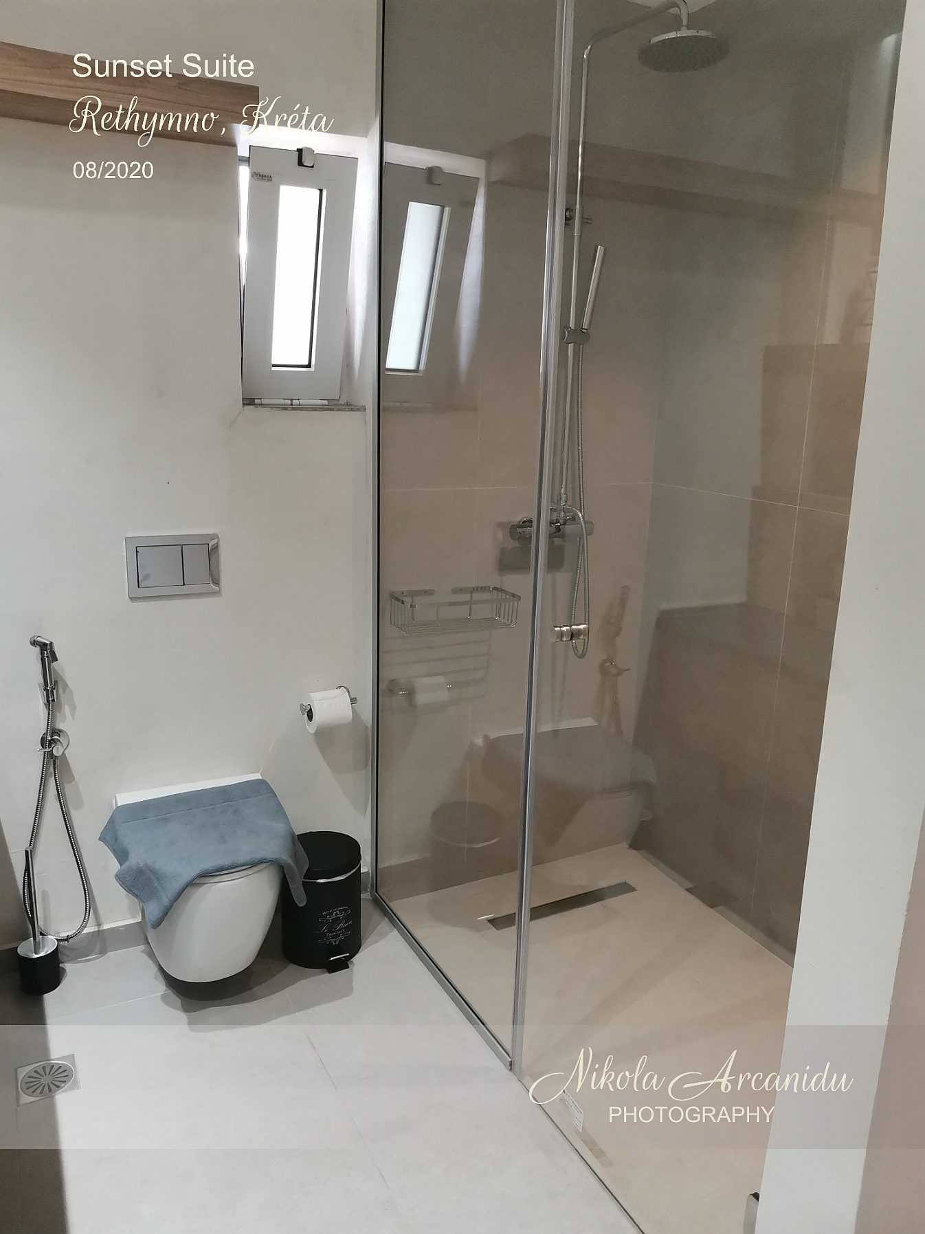 V koupelně byla připravena drogerie - vlasový kondicionér, šampón, tělový gel a mýdlo - vše bylo v podobě olivového oleje. Dál byl v koupelně připraven fén a dostatek toaletního papíru.