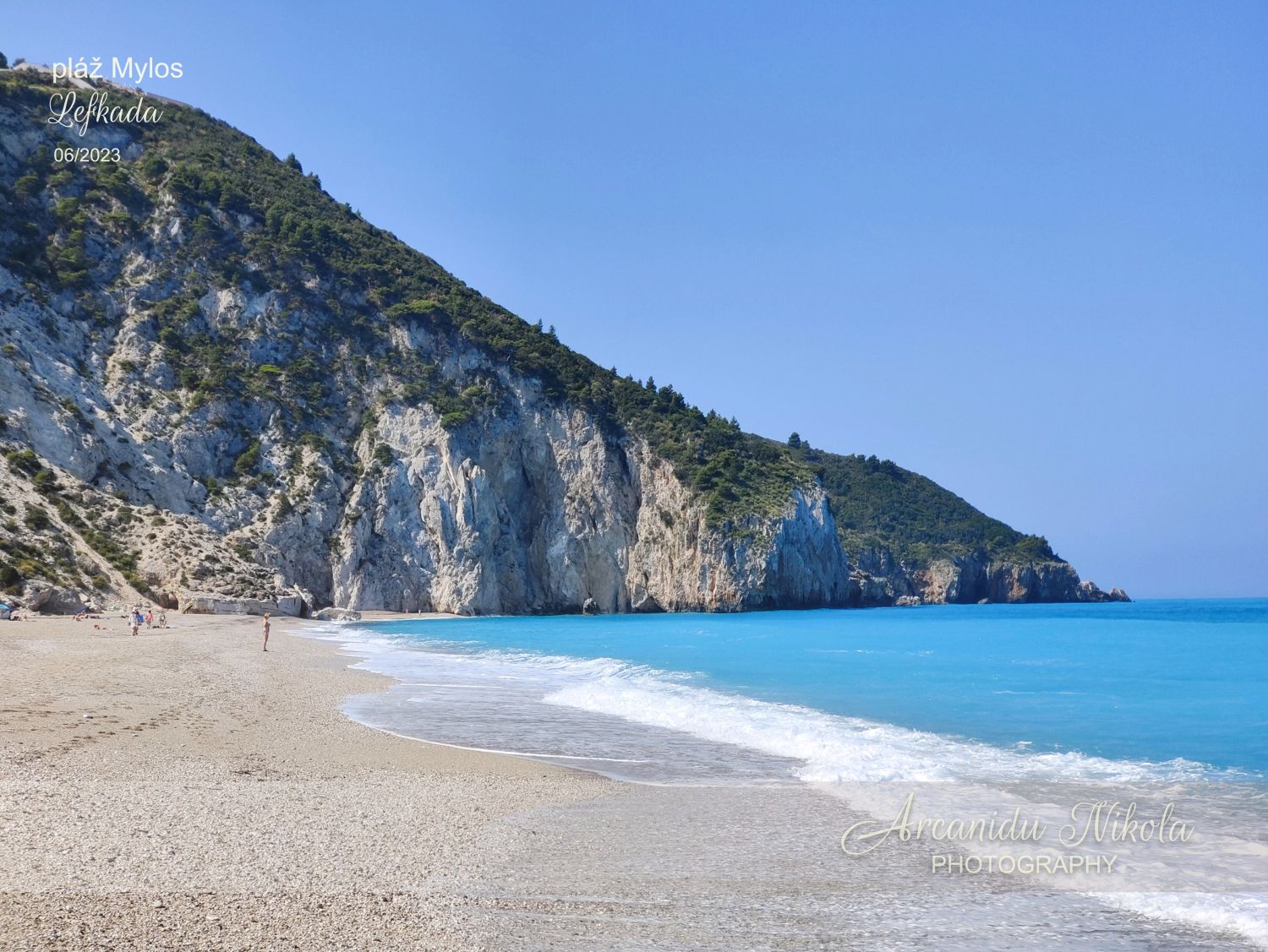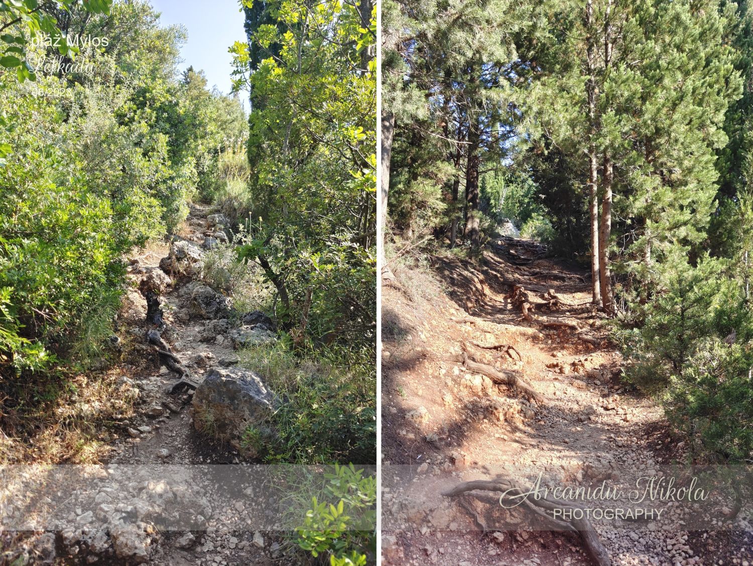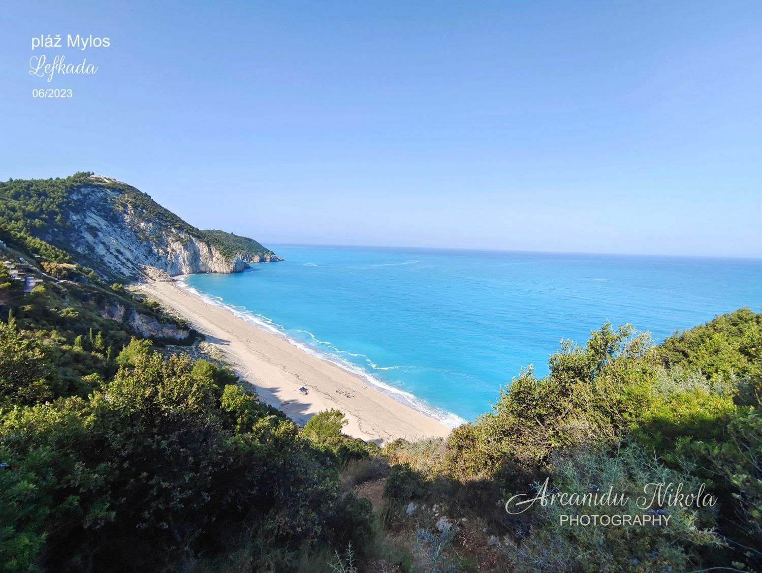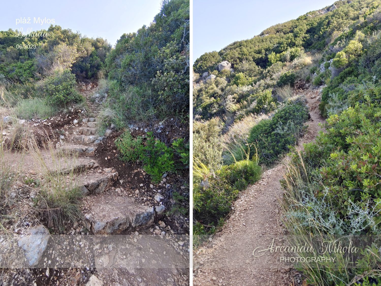 úzké a klikaté cestě pořád nahoru. Kdo má špatnou fyzičku či problém s pohybem, možná to po několika minutách vzdá, otočí se a raději zamíří na pláž v Agios Nikitas… Jestliže vydržíte, stanete na krásném místě, odkud je parádní výhled na pláž Mylos.