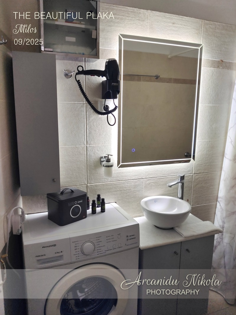 V koupelně je sprcha (pozor, vchází se do ní sestupem po 1 schodu dolů), pračka, osvětlené zrcadlo a toaleta. Ručníky, osušky a náplň na praní prádla, kterou jsme využili, a vyprali oblečení z cesty.