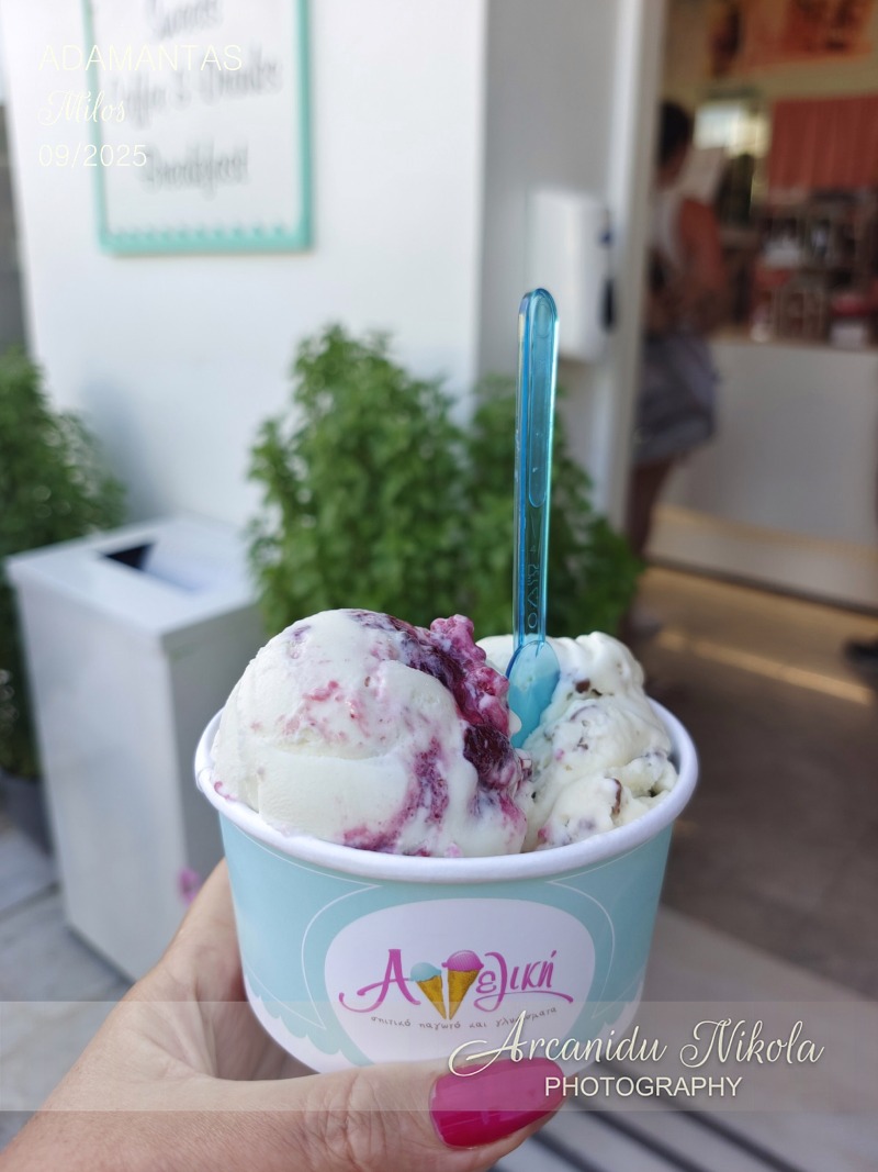 Aggeliki ice cream shop - Výborná zmrzlina. Ochutnali jsme mascarpone s malinami+ bílou čokoládu s kousky mléčné čokolády. Zastavte se tady, mají velkou nabídku, jistě si vyberete. Rychlejší je osobní objednávka než od stolu.