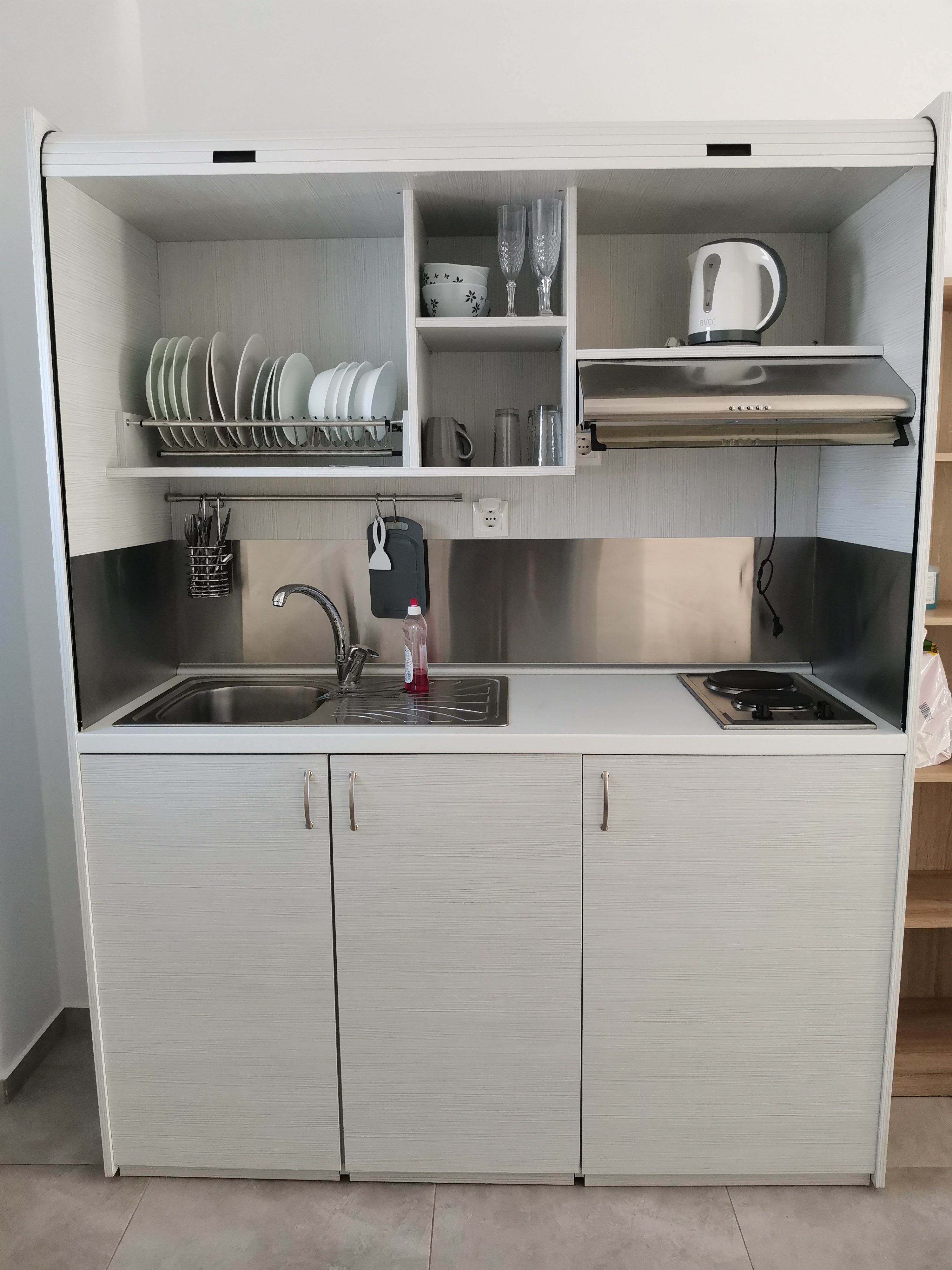 Pokoj byl malý, ale obsahoval vše nutné, co turista potřebuje. V kuchyni talíře, misky, velký hrnec, malá pánev a mísa. Příbory, sklenice. Varná plotýnková deska, rychlovarná konvice, pomůcky na mytí nádobí, koš - odpadky byly každý den vyhozené.