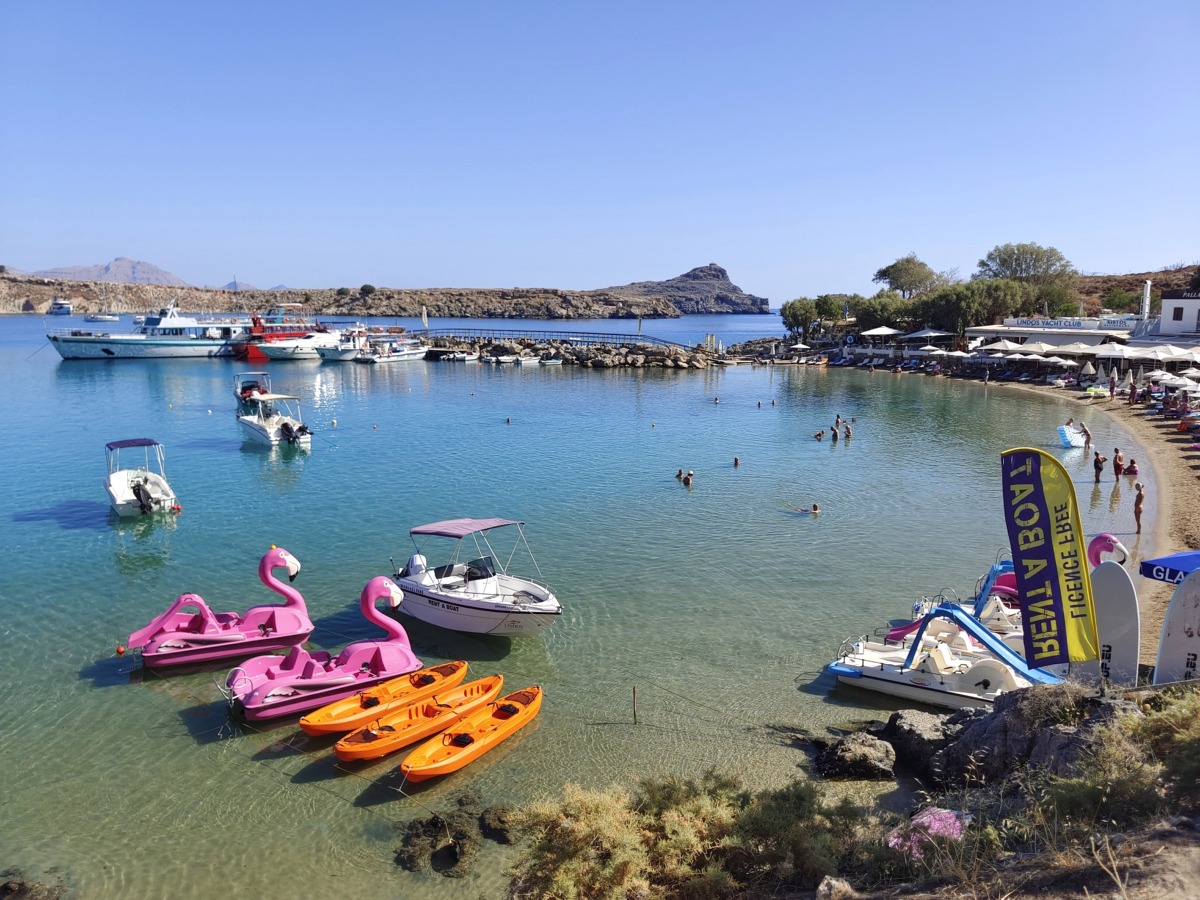Lindos má tři pláže. Lindos Megali paralia (hlavní pláž Lindosu, největší a nejrušnější), pláž Pallas (menší, ale také přeplněná) a Zátoka svatého Pavla (Agios Pavlos, zátoka chráněná okolními útesy), ta je vzdálenější od prvních dvou).
