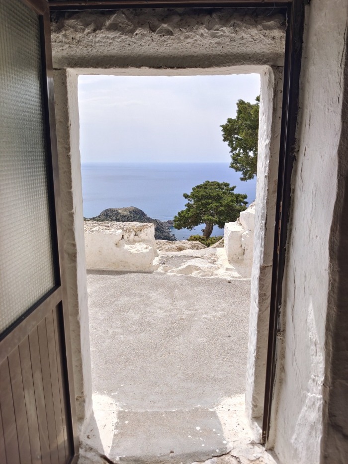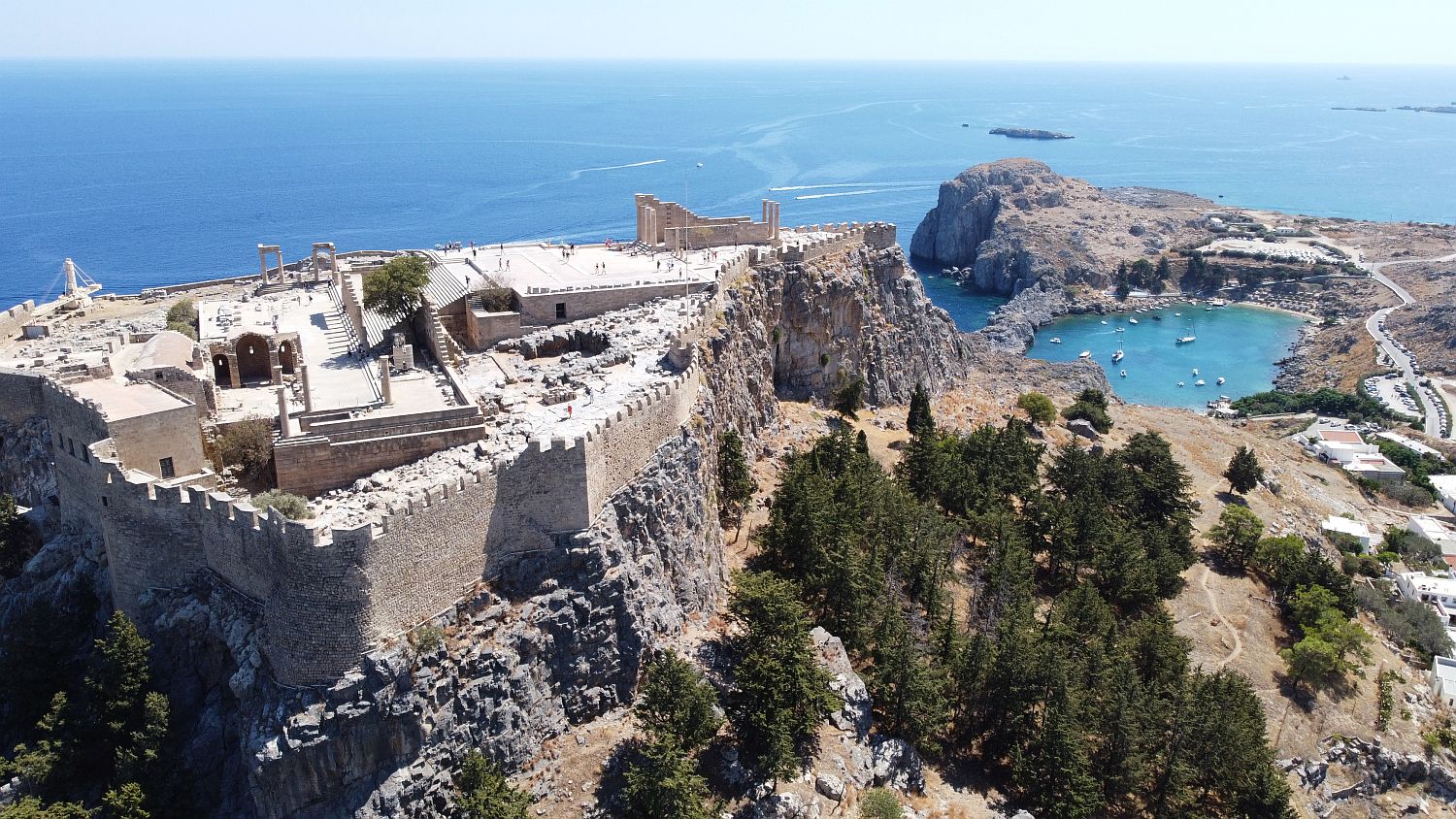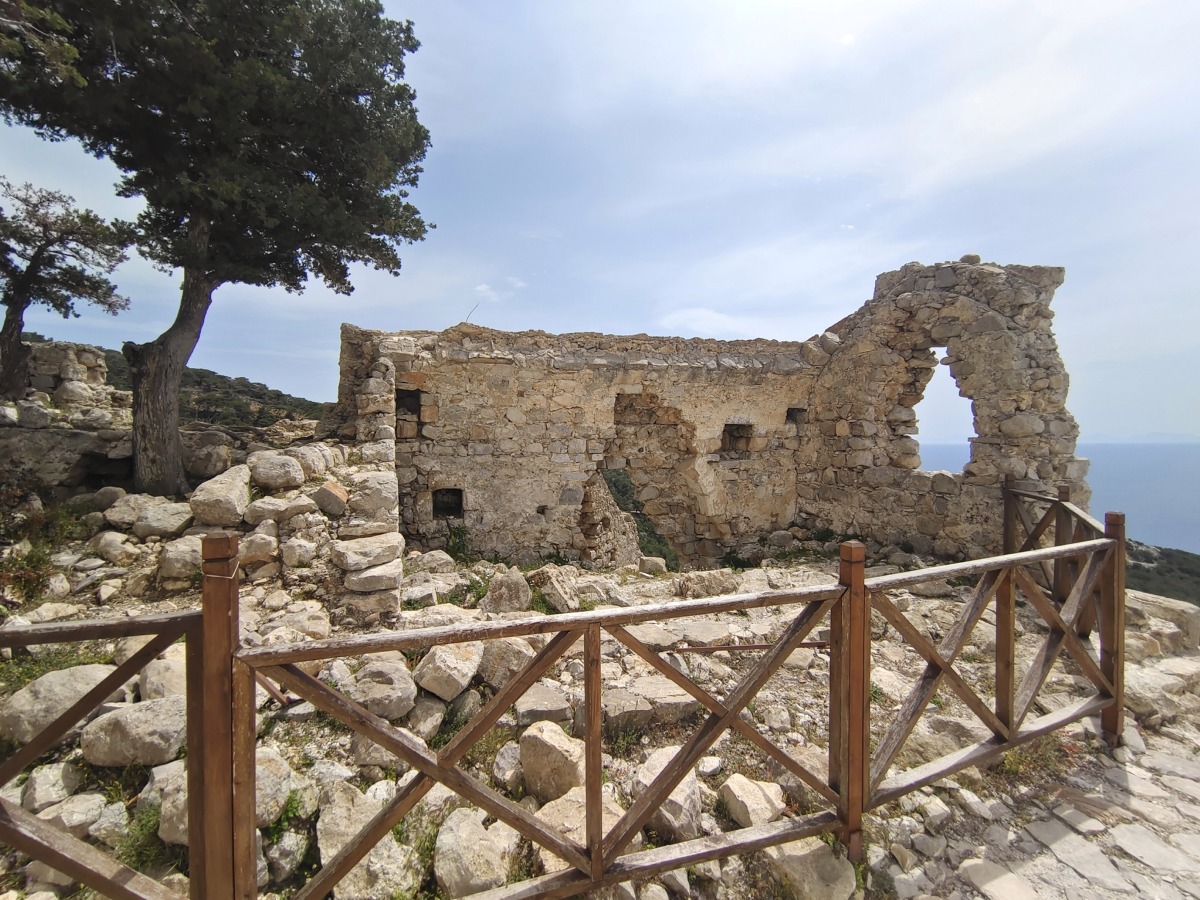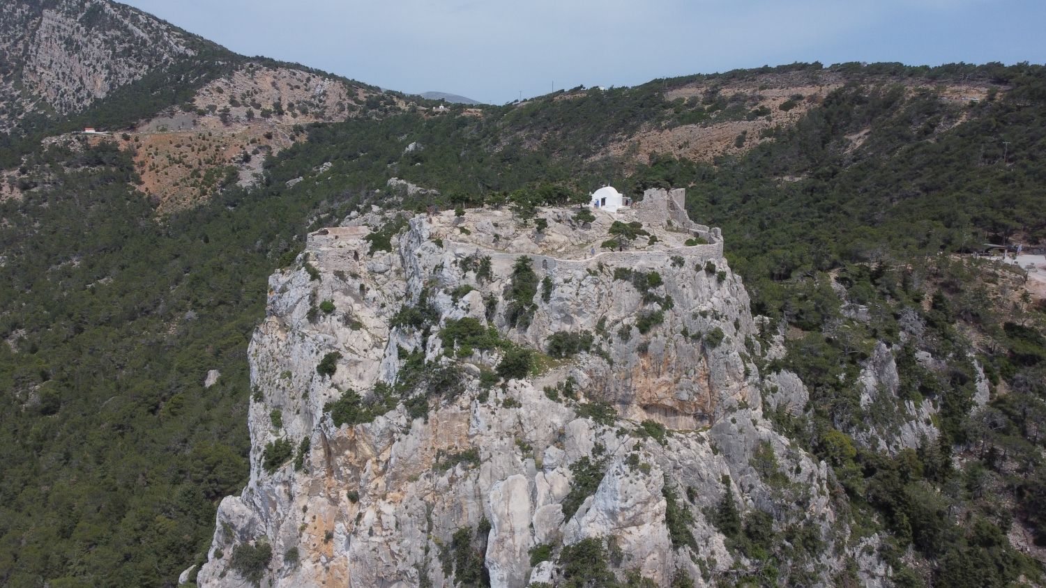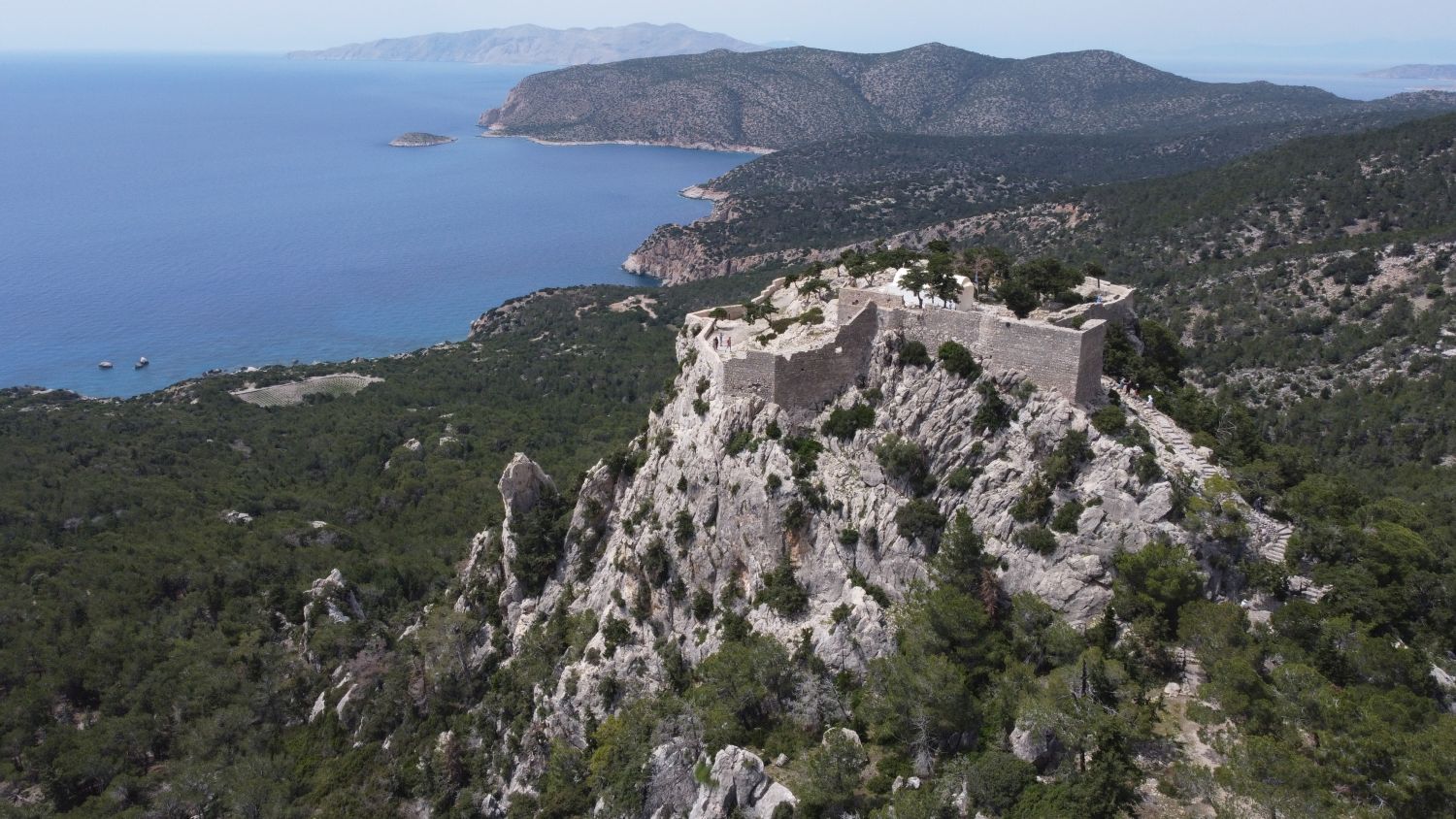 Hrad Monolithos se nachází ve výšce 236 metrů a je umístěný na jediném skalním výběžku – proto název Monolithos – s výhledem na ostrov Chalki.