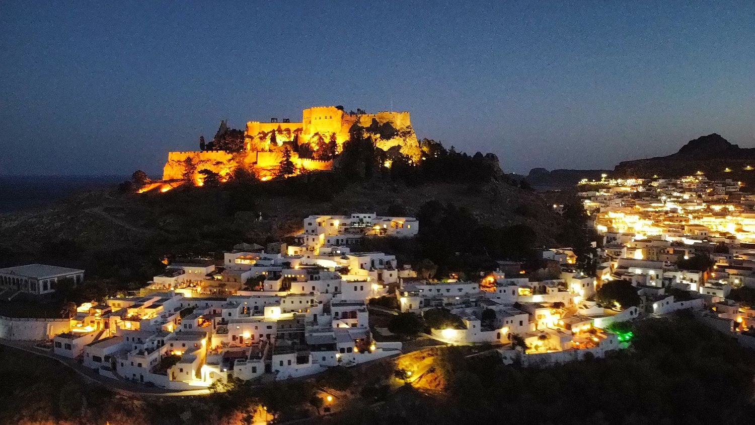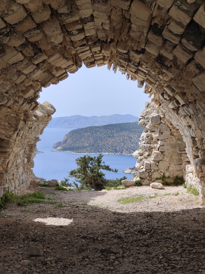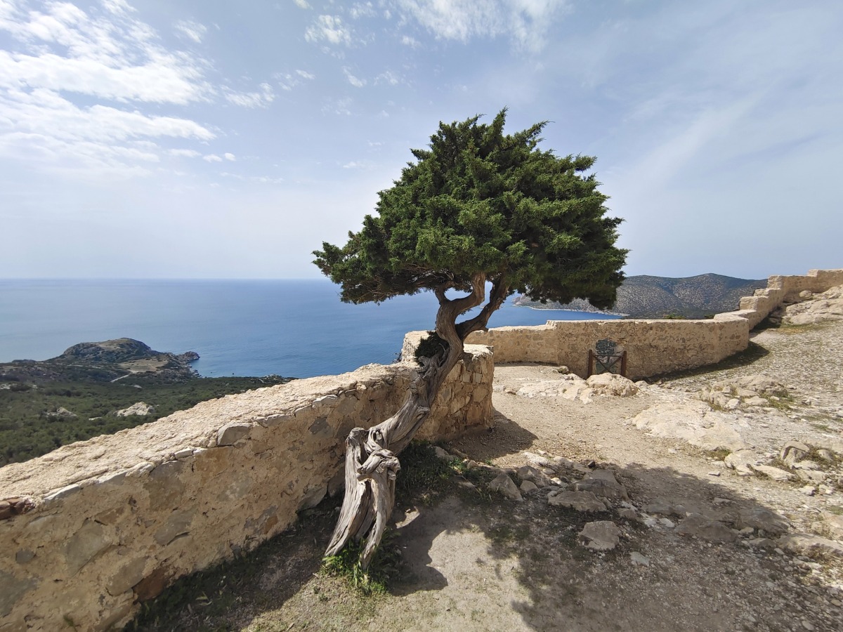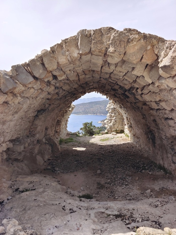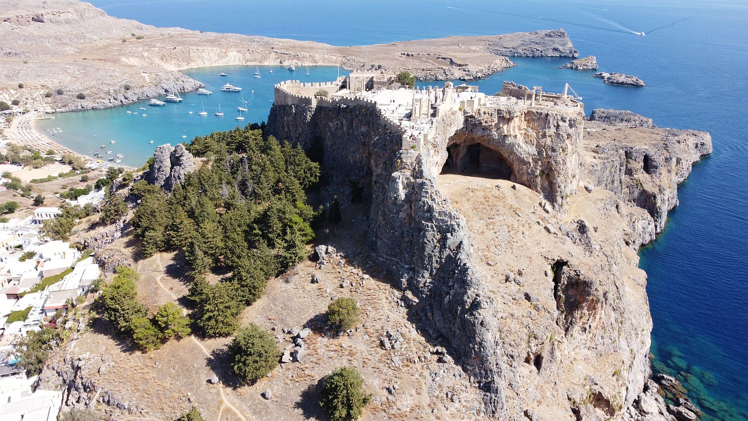 Hrad Monolithos se nachází ve výšce 236 metrů a je umístěný na jediném skalním výběžku – proto název Monolithos – s výhledem na ostrov Chalki.