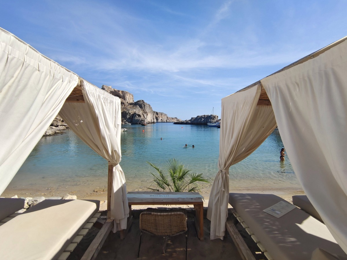 Vlevo skoro na konci pláže pronajímá restaurace Philosophpia lehátka s chladícími boxy a uzamykatelným trezorem, kde si uchováte své cennosti, a můžete si pomoci QR kódu objednat jídlo a oni vám ho na pláž přinesou.