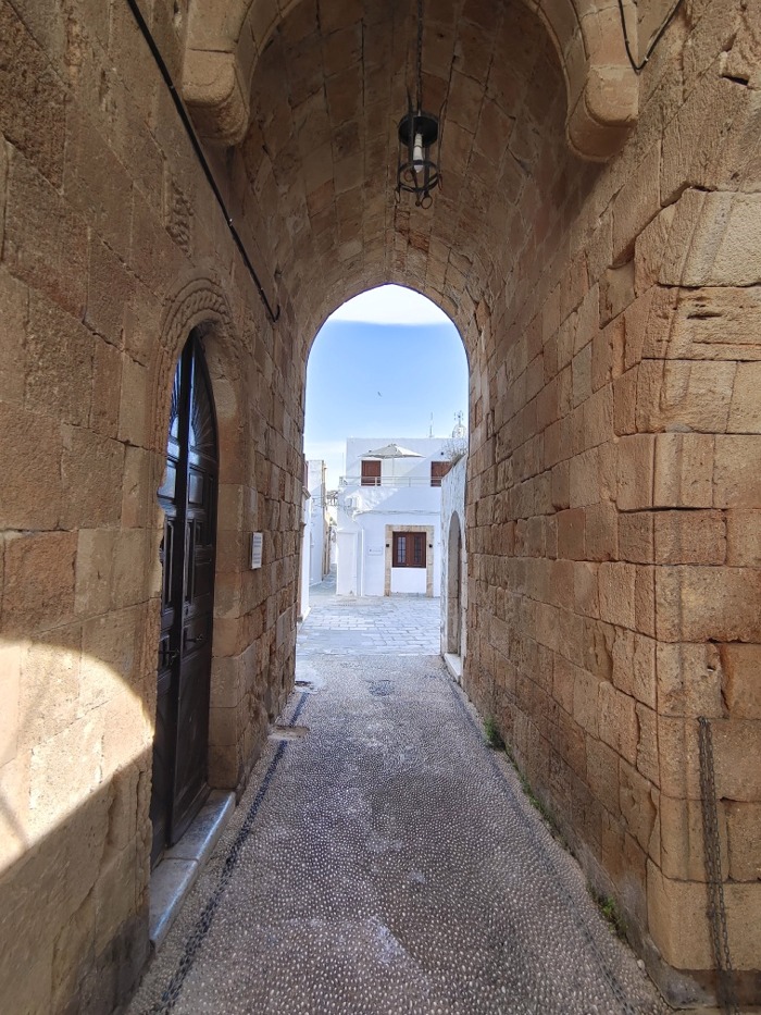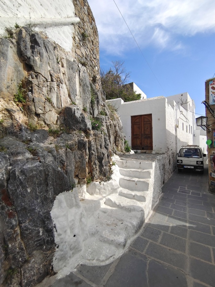 Když vstoupíte do archeologického naleziště Akropole, uvidíte reliéf lodi, který byl vytesán do skály z roku 180 před naším letopočtem. Můžete vystoupat po velkém schodišti vedoucím k administrativním budovám rytířů. Poté, co jimi projdete,