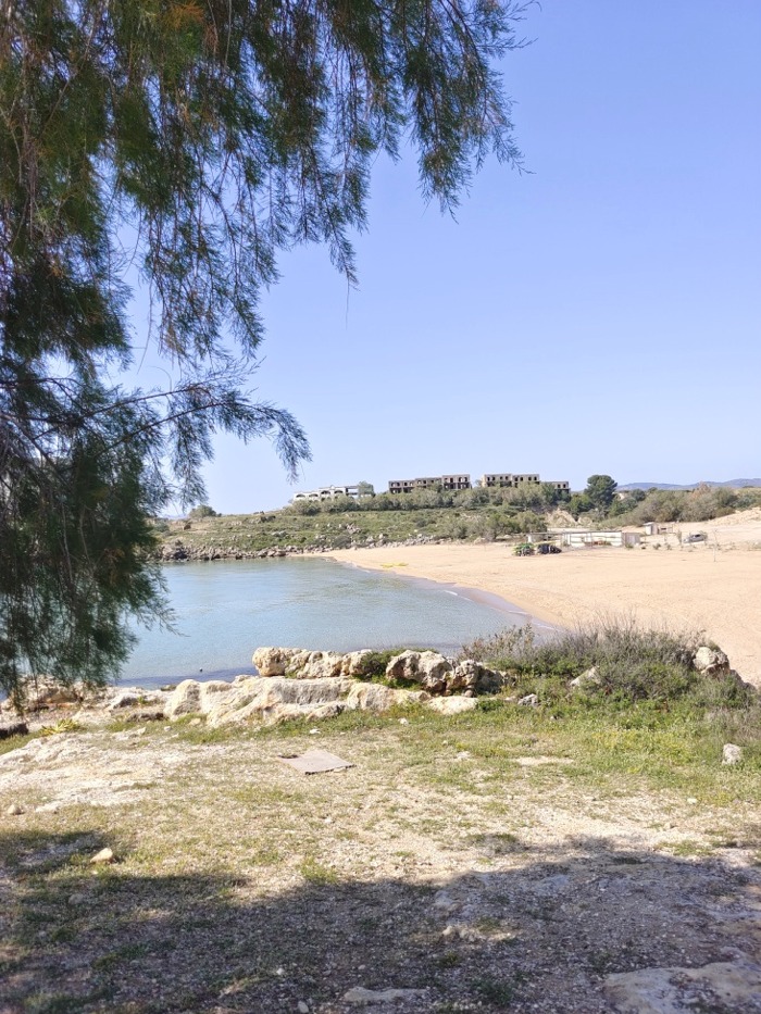 V květnu 2025 byla cesta na pláž díky jarním kytičkám kouzelnější, a když jsme přijeli před 10. hodinou, byli jsme tam zcela sami. Dokonce ani bar ještě nefungoval, všude prázdno.