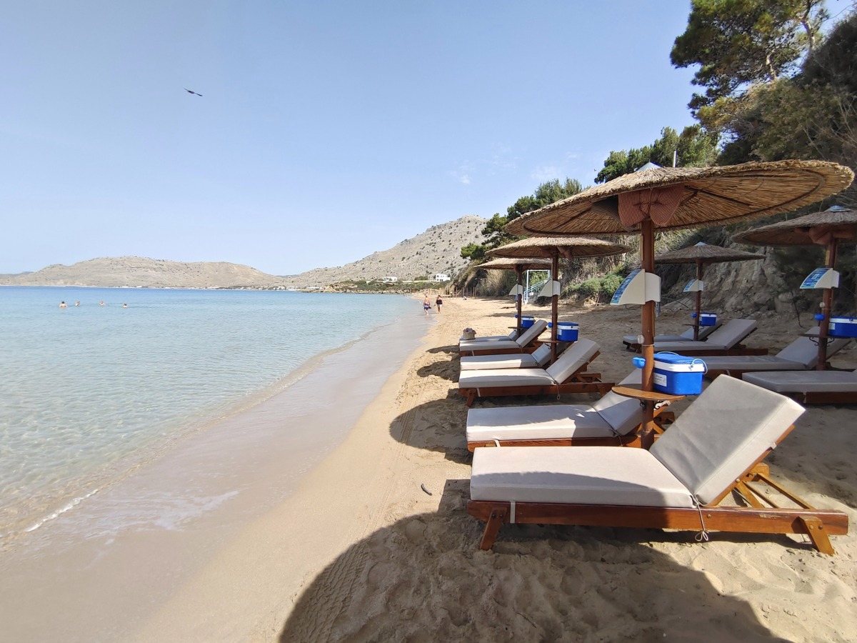 je plně organizovaná s lehátky, slunečníky, rybářskými tavernami a vodními sporty. Až tak moc organizovaná, že místo pro svoji osušku není snadné najít. Pokud přijdete ráno, dejte se vlevo k baru Nefeli,