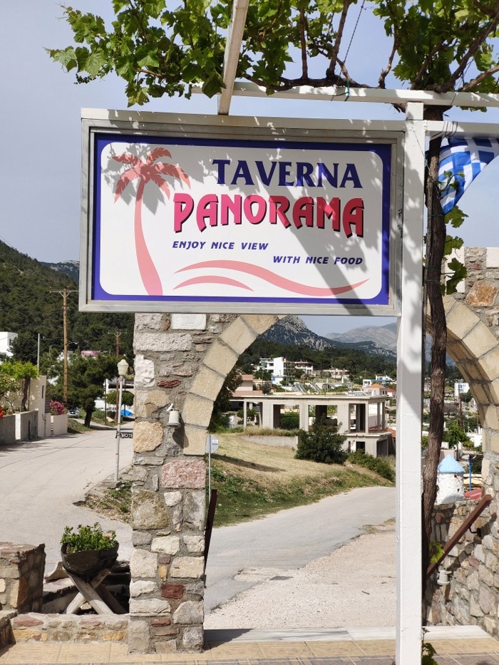 Cestou z hradu jsme se zastavili v taverně Panorama, protože jsme chtěli Mousakas a frappe, obojí naštěstí měli.... Taverna má milého číšníka, skvělé řecké jídlo a překrásný panoramatický výhled, doporučuji.