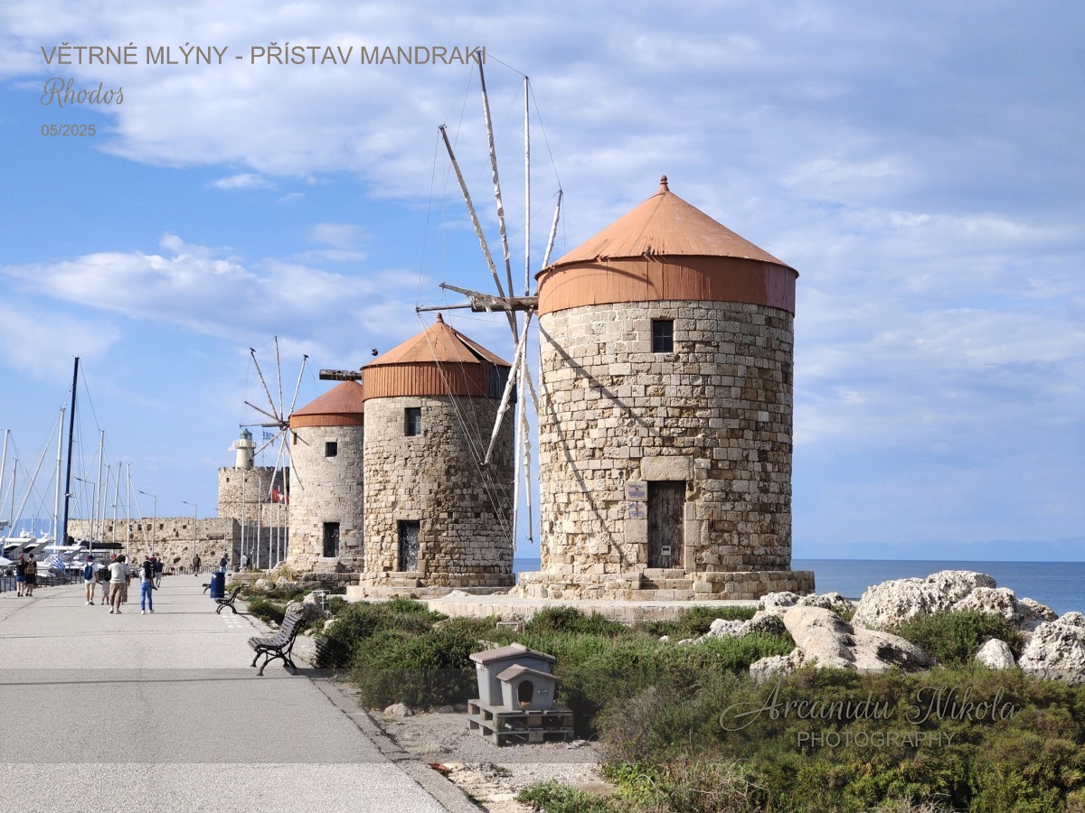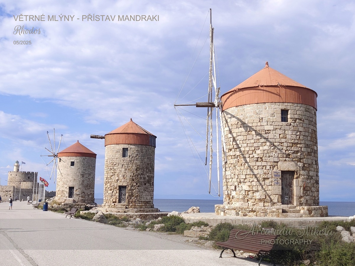 Nejznámější 3 větrné mlýny na celém ostrově Rhodos se nacházejí na východním molu přístavu Mandraki. Tyto středověké větrné mlýny se používaly k mletí obilí, které pocházelo z komerčních lodí kotvících v přístavu.