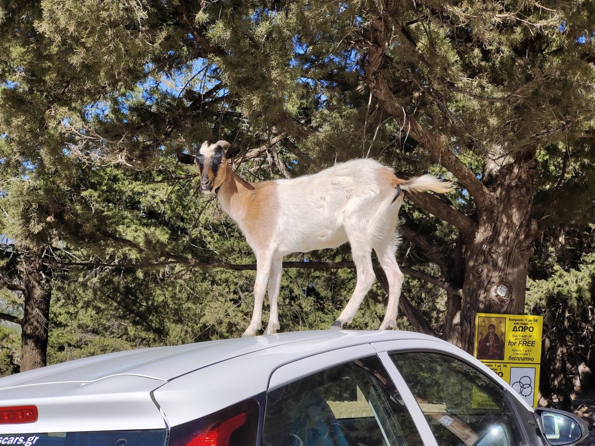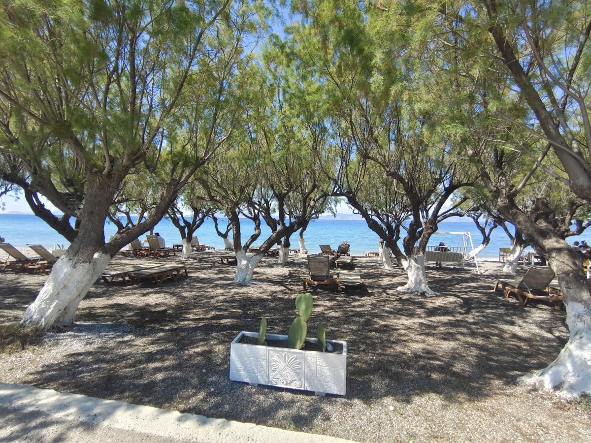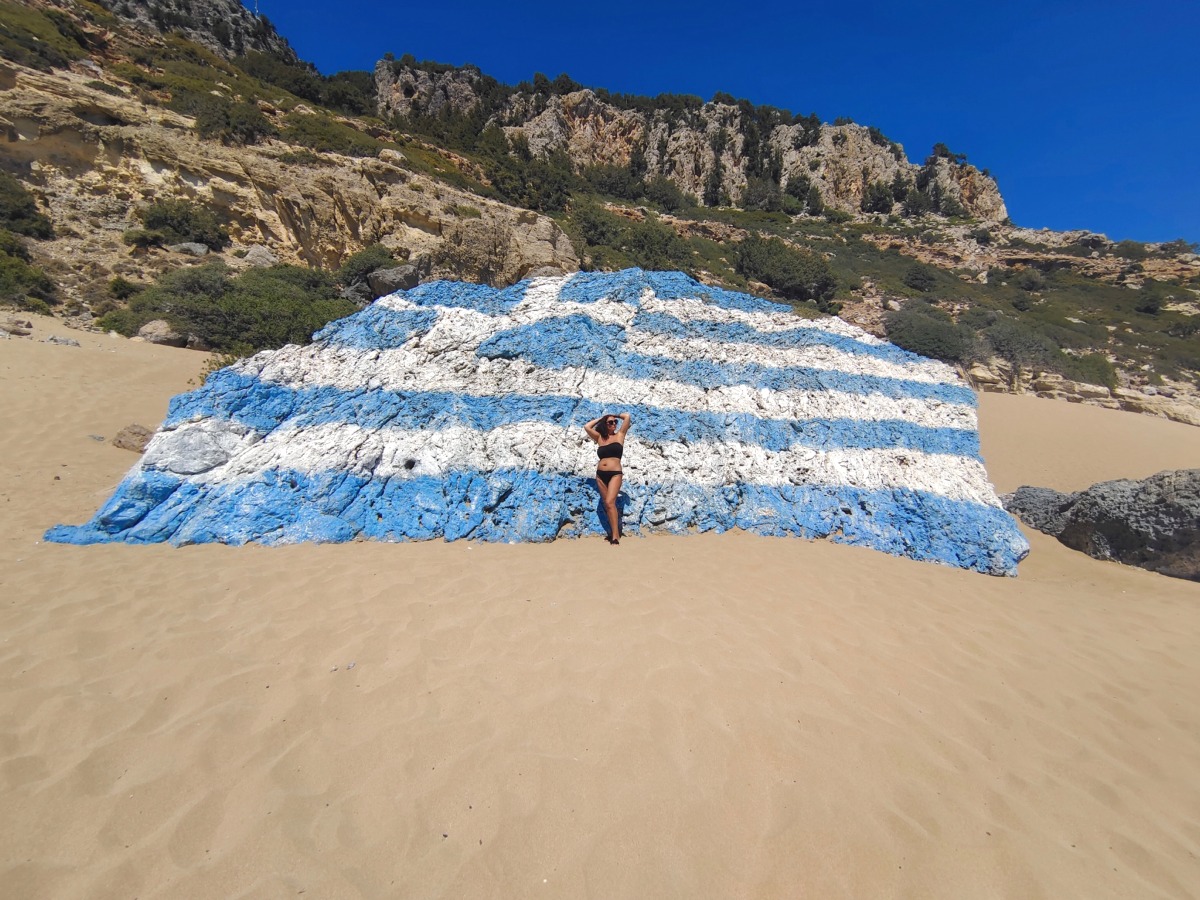 Parkoviště se nachází přímo u pláže. A podél zaparkovaných aut je mnoho stromů, takže zde lze najít i přírodní stín. Na pláži je řeckou vlajkou pomalovaný kámen.