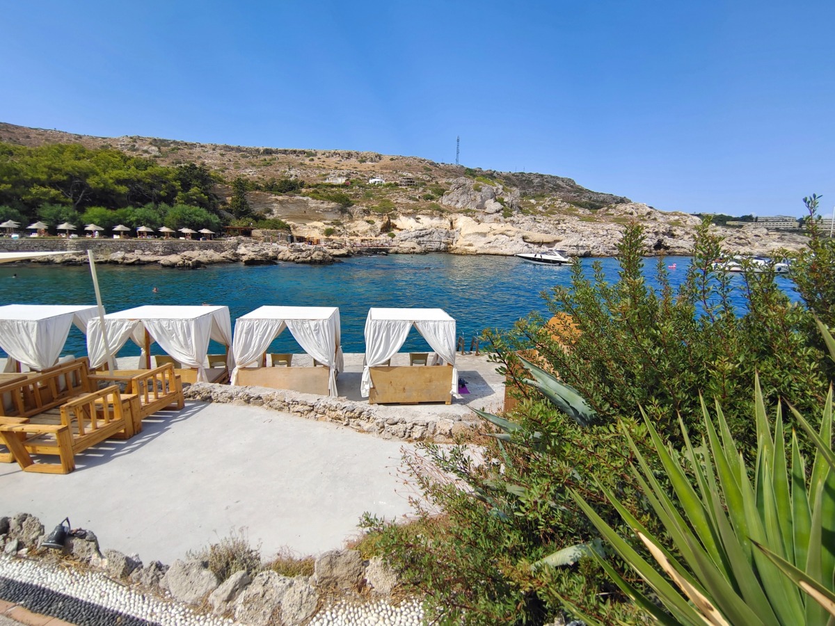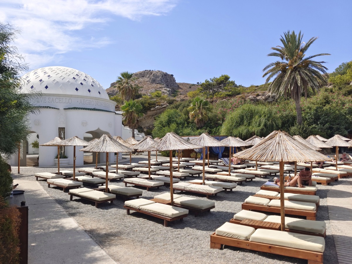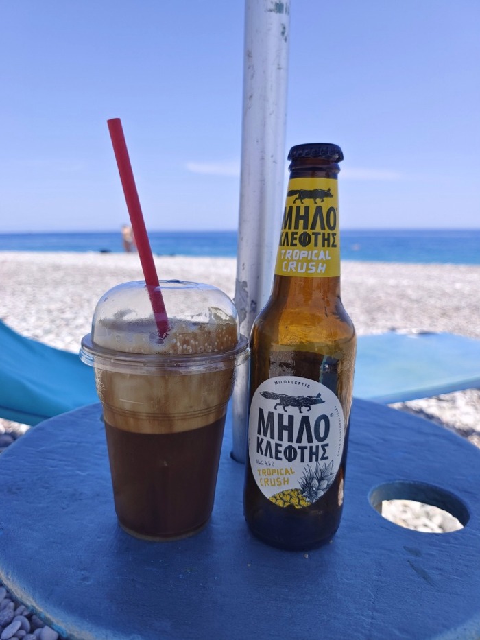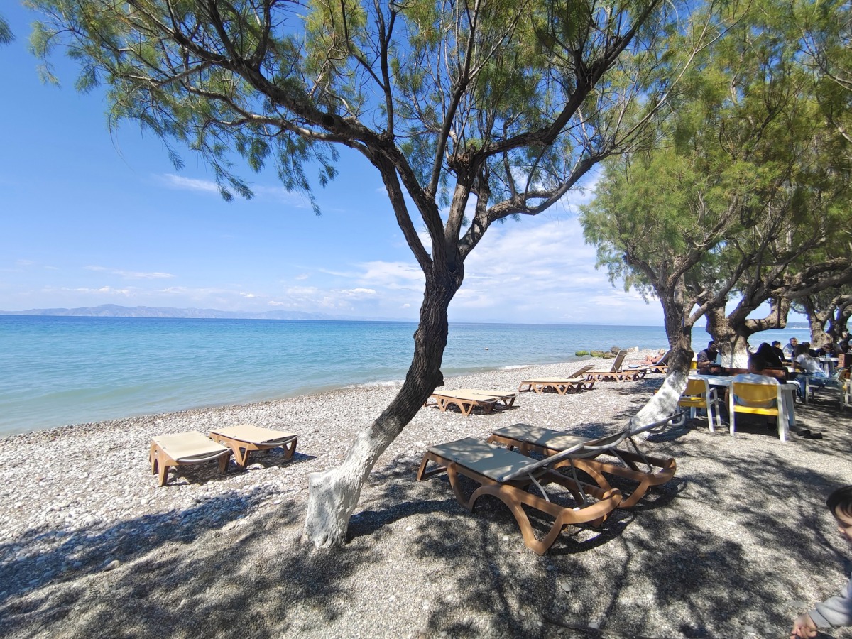 Lehátka se platí zvlášť. 25 € za pár jsme ale dát nechtěli, a lehli jsme si na svoje osušky vzadu na oblázky, vedle baru. Frappe (3,70 €) bylo chutné. Na parkovišti bylo mnoho míst pro auta.