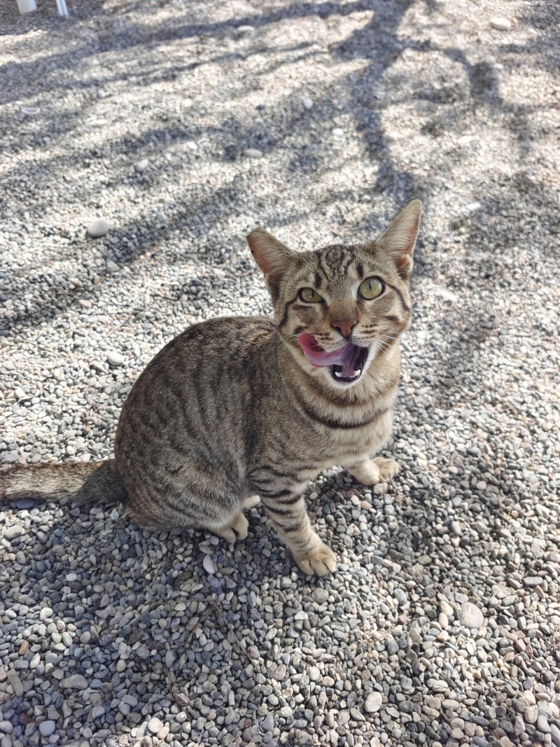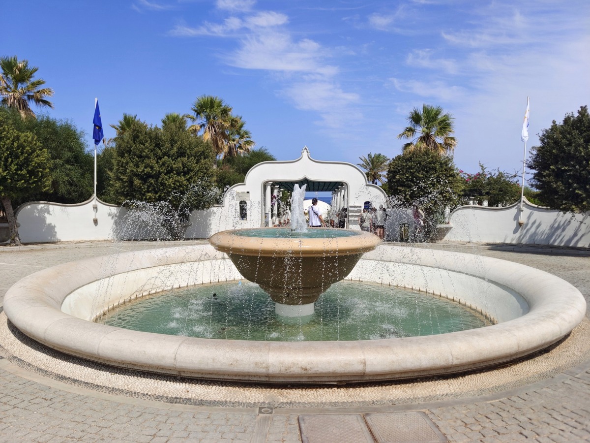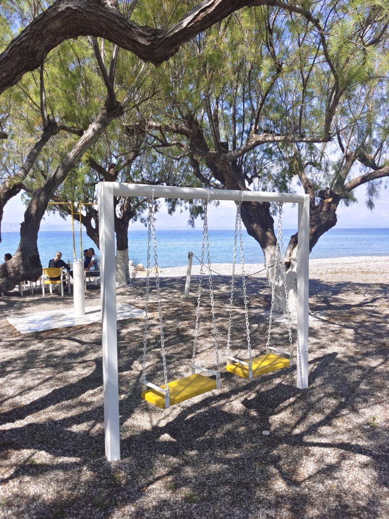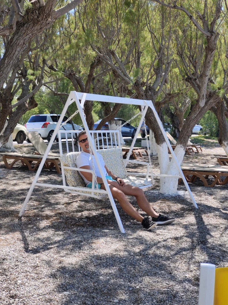 Lehátka se platí zvlášť. 25 € za pár jsme ale dát nechtěli, a lehli jsme si na svoje osušky vzadu na oblázky, vedle baru. Frappe (3,70 €) bylo chutné. Na parkovišti bylo mnoho míst pro auta.