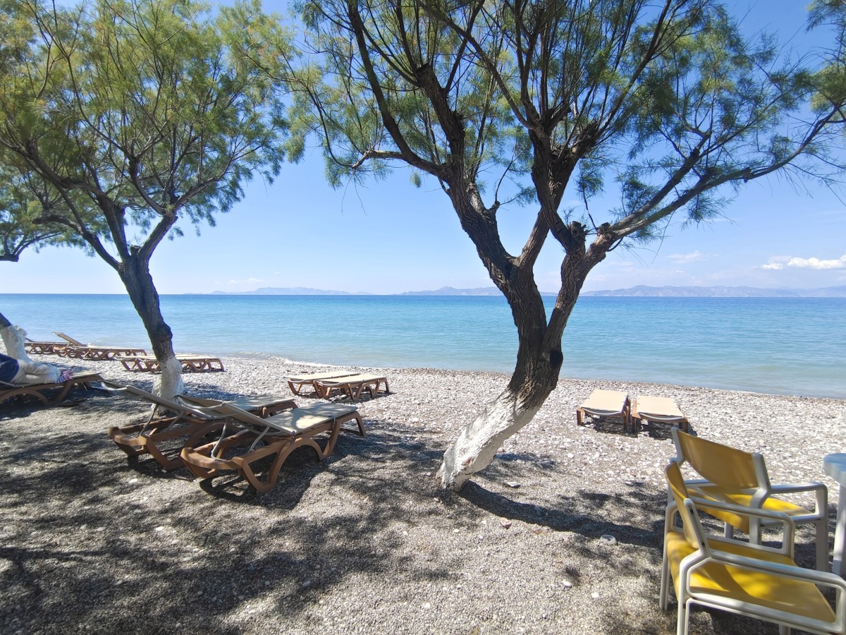 Traganou je částečně organizovaná pláž s lehátky a slunečníky k pronájmu se stánkem s občerstvením. Klidné místo jsme si našli u skály, ale dostat se tam vyžaduje několik minut chůze.