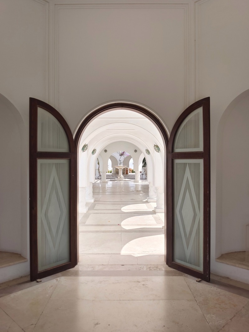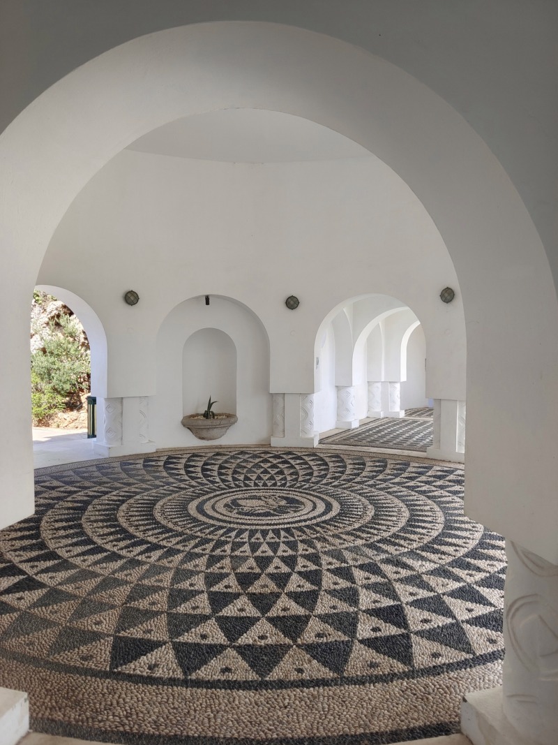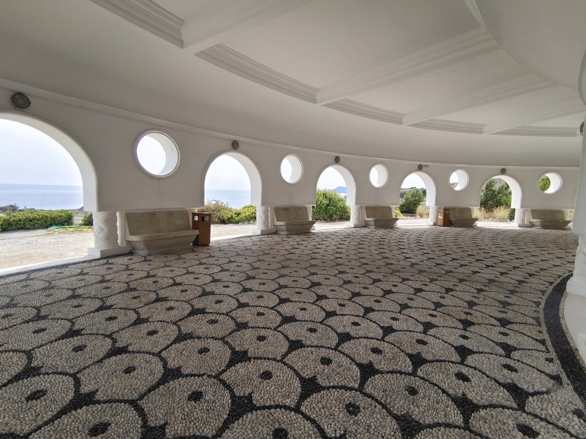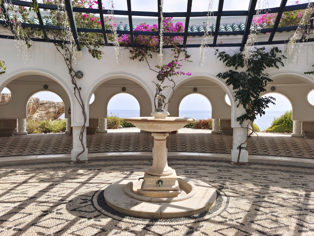 Hlavní budova má ohromující výhled na moře přes klenuté a kulaté dveřní a okenní otvory. Místo stvořené pro svatby (např. kamarád se sem vyrazil oženit-viz foto níže).