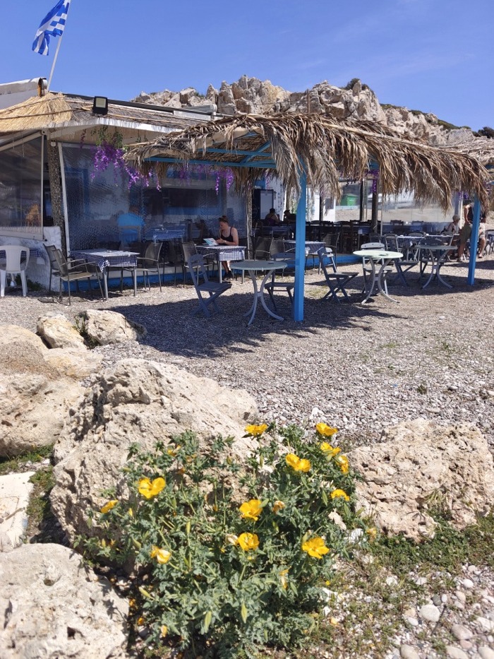První taverna na pláži - "taverna Traounou" je hned vedle veřejného parkoviště (zdarma), je pro veřejnost, ale bar nad ní pouze pro vojáky. Tam nesmíte ani parkovat.