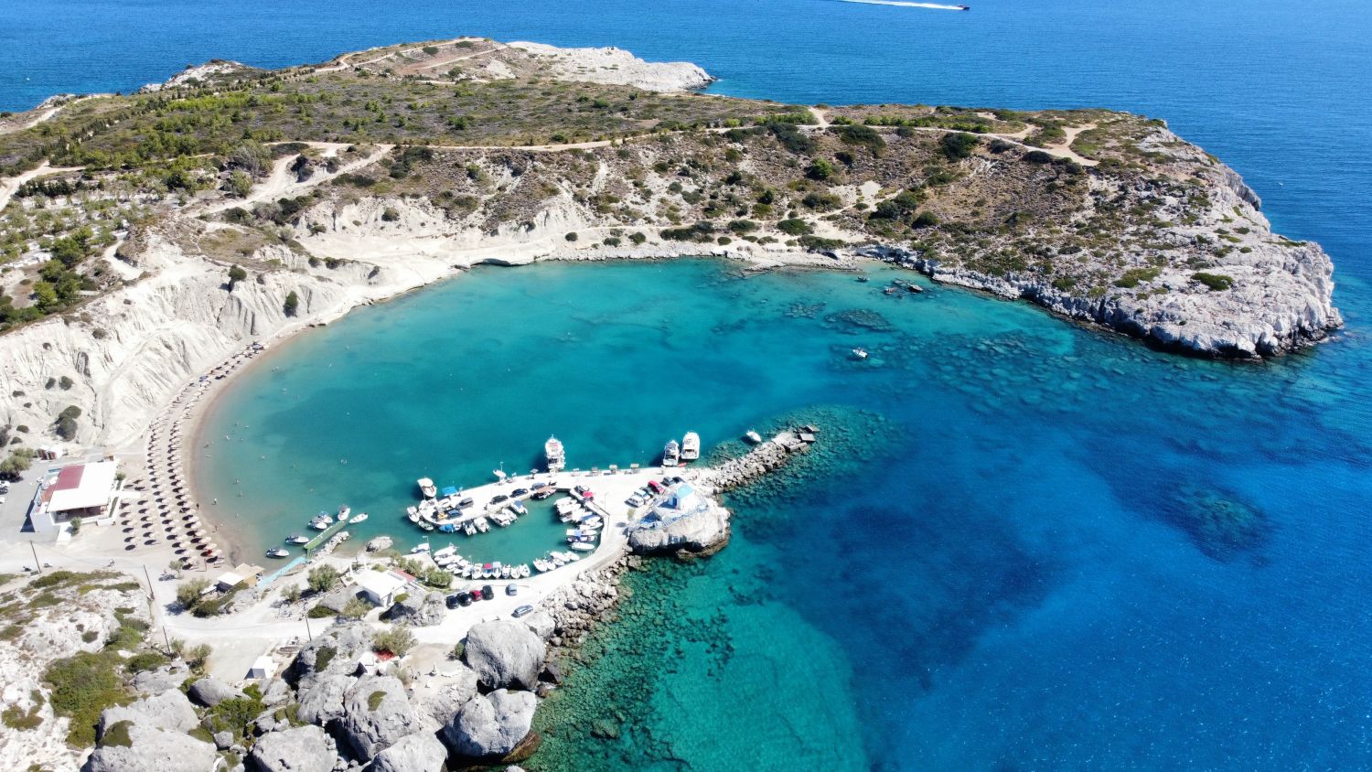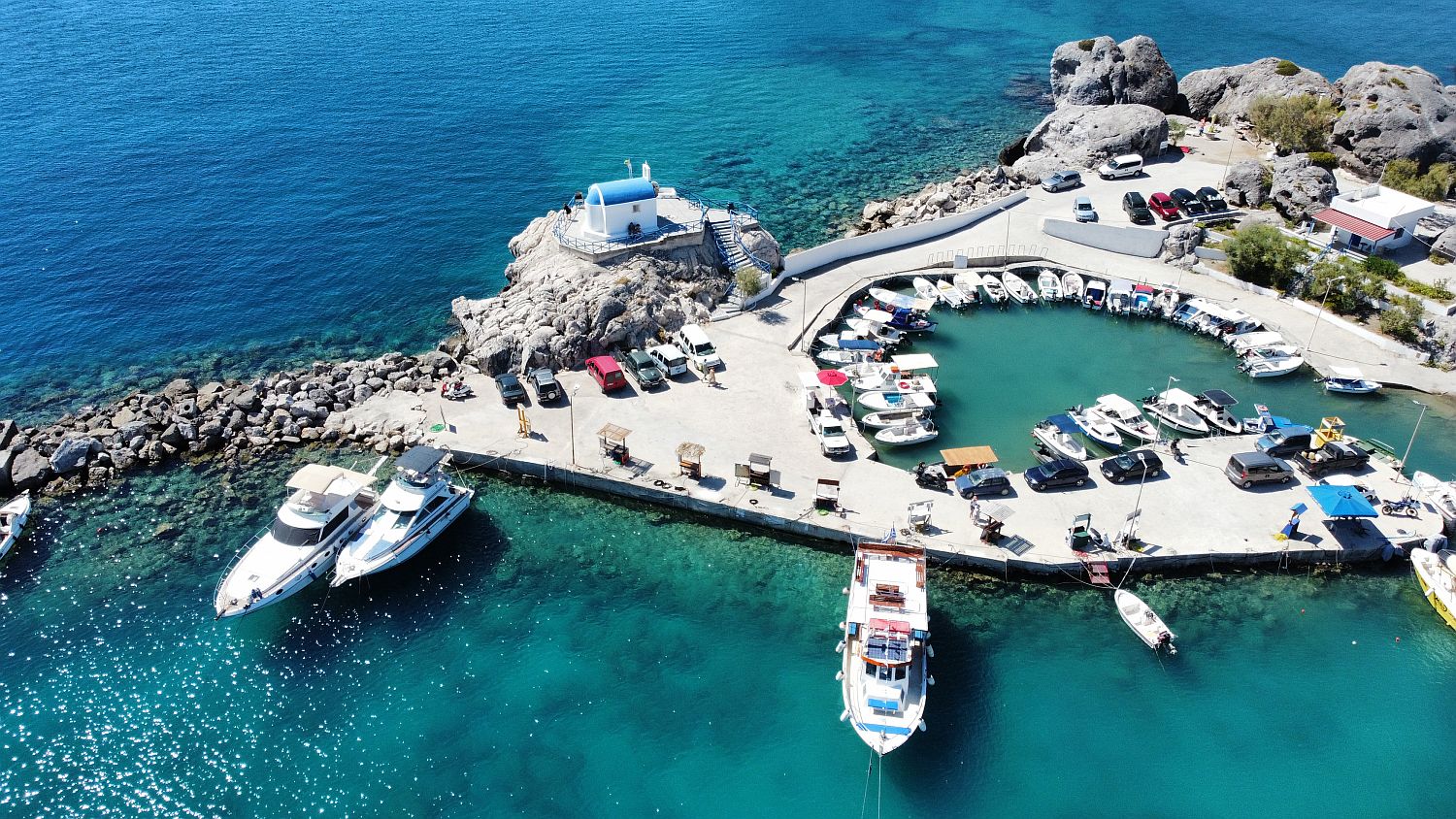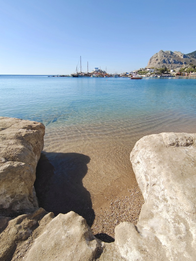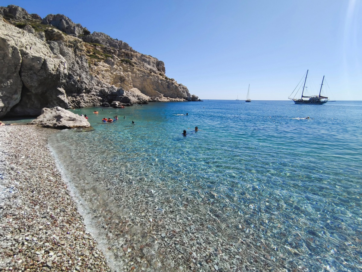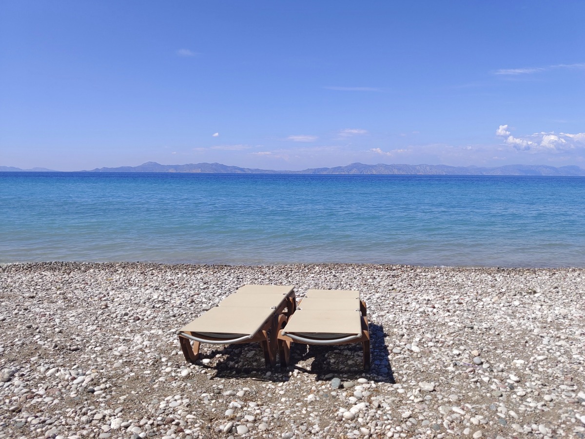 Ale jinak je moře krásně modré a když koukáte na druhou stranu, uvidíte ostrov Symi a část Turecka. Nad hlavami létají letadla.