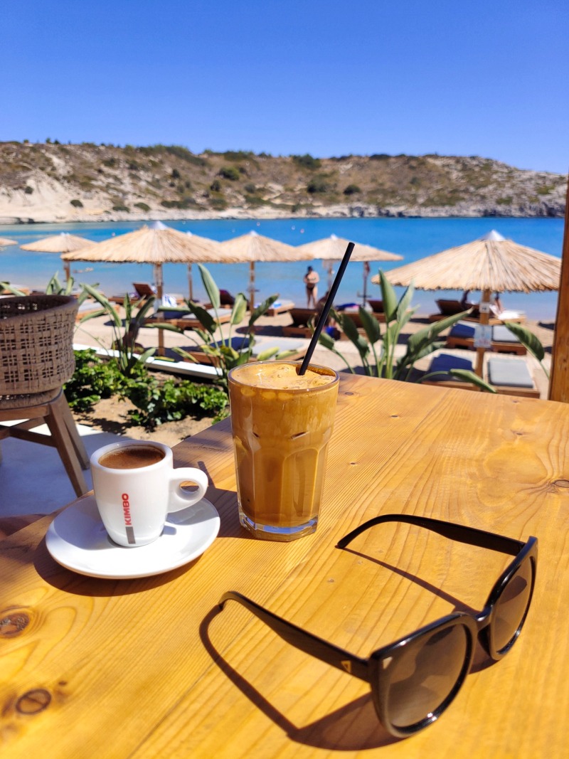 Za lehátka se slunečníkem jsme v květnu 2025 zaplatili 15 €, za Frappe 2,70 €.
