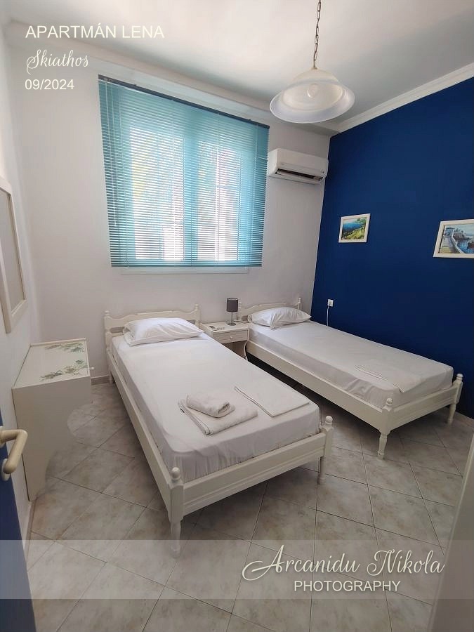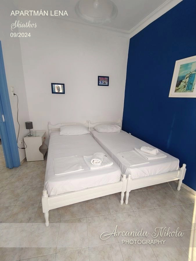 Celé ubytování je řešeno v jemných letních barvách bílá + modrá, které k Řecku patří.