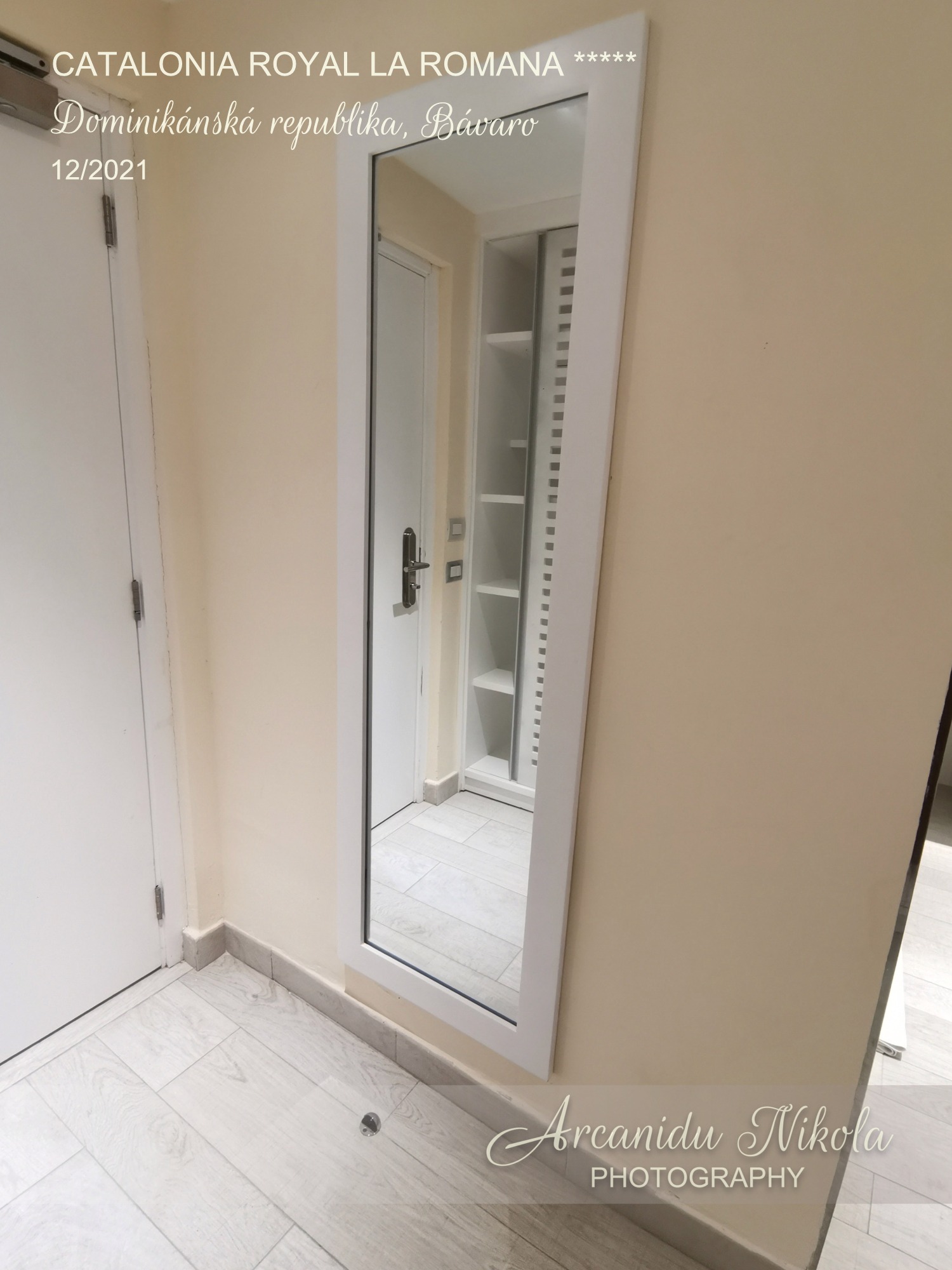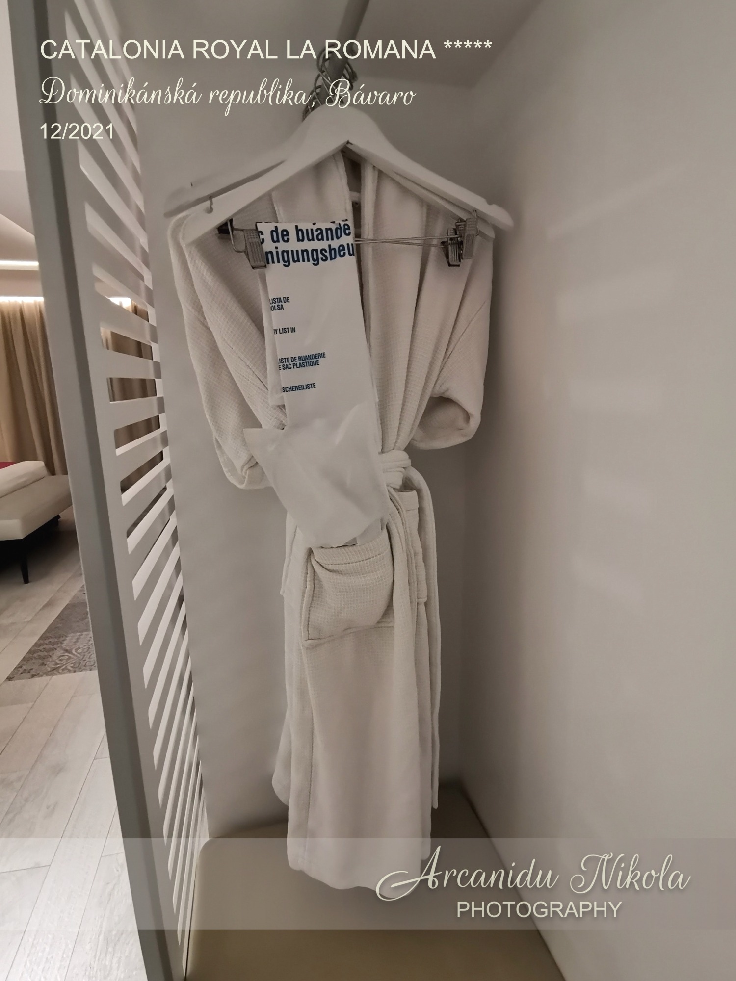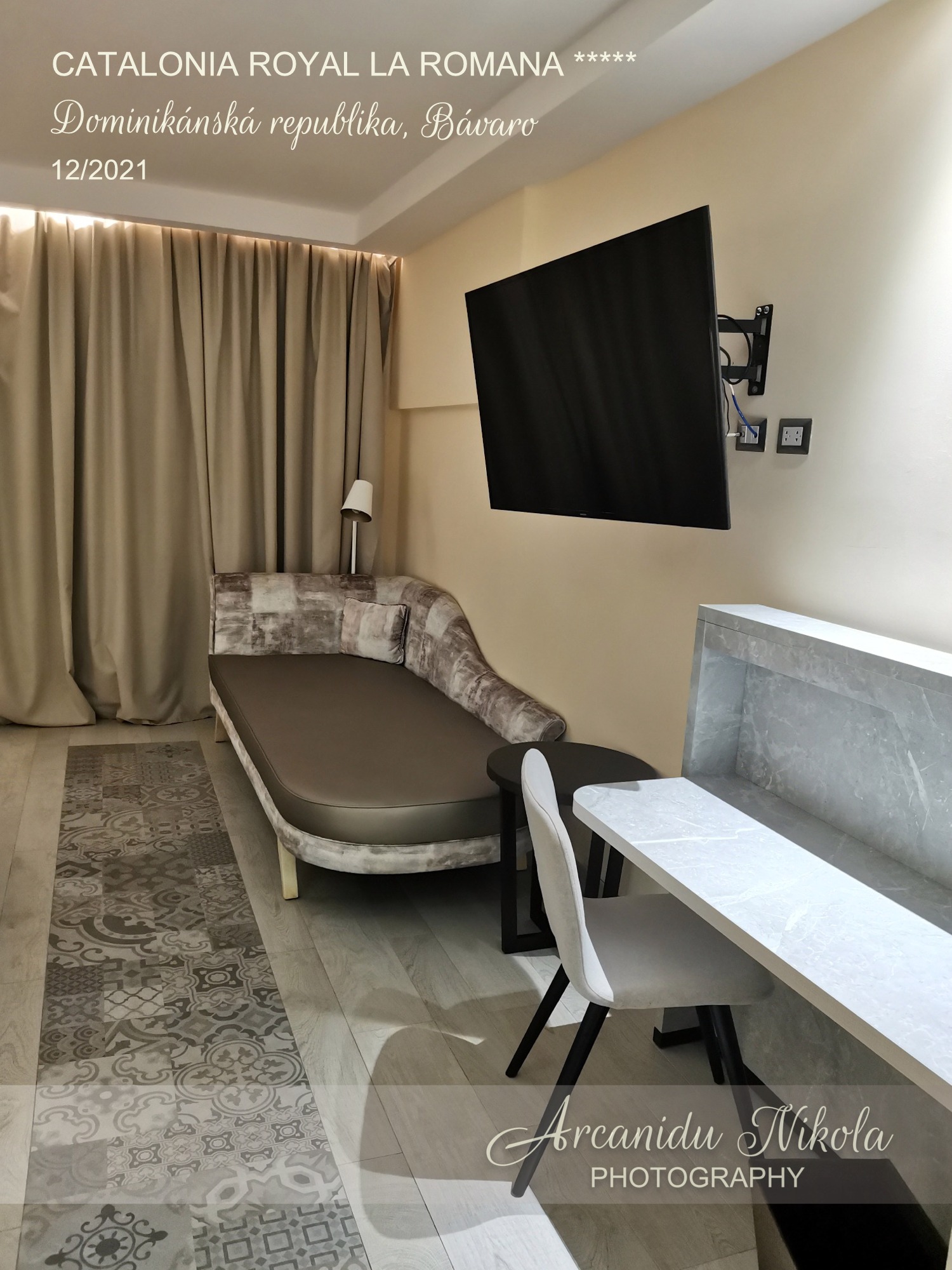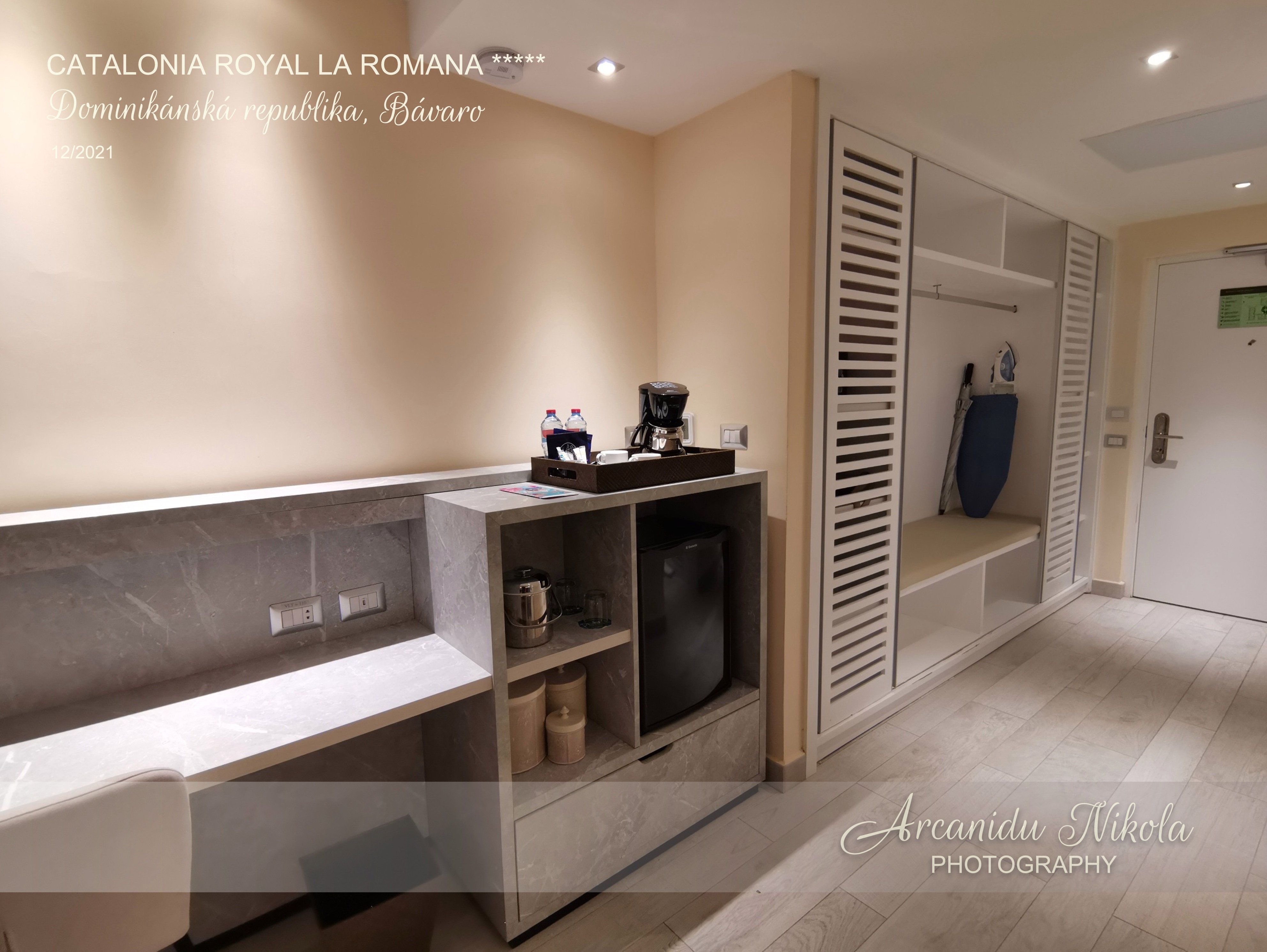 Pokoj je překrásný. Ve skříni jsou župany s papučemi, žehlička a prkno, deštník, trezor, osušky na pláž a deka. Pomůcky na přípravu kávy, minibar s pitím. TV. Nad postelí velký stropní větrák, samozřejmě v pokoji je i klimatizace.