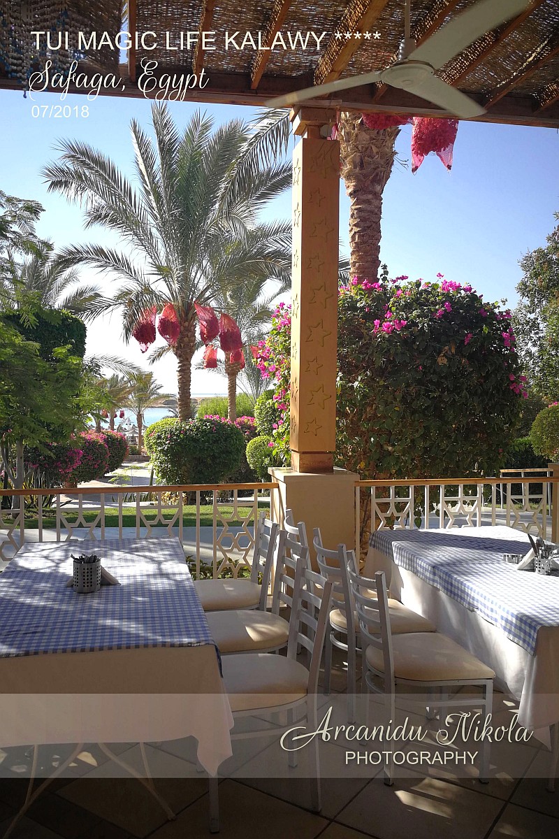 Restaurace je vkusně umístěna nad bazénem a je zde i výhled na moře. Uvnitř příjemná klimatizace a venku množství větráků nad hlavami.