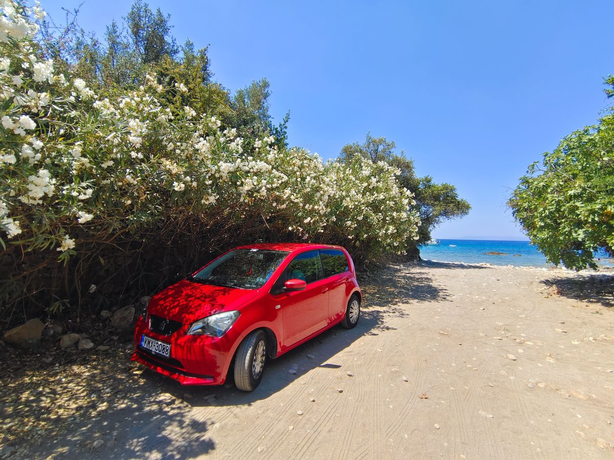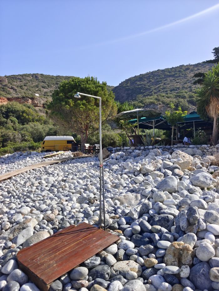 i tam může stát auto několik hodin ve stínu. Co se týče stínu na pláži, pod skálou je mnoho hodin stín, na otevřené části pláži je vhodné použít slunečník či jinou pomůcku. My měli štěstí, že jsme ráno po 9té hodině byli na pláži