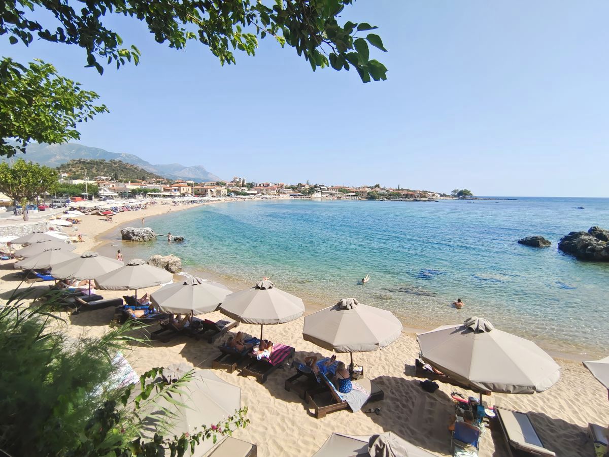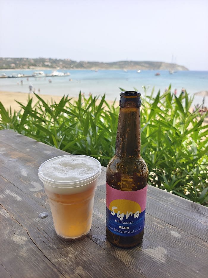 O kousek dál nabízejí u hotelu Methoni také lehátka zdarma s konzumací, a nad lehátky je příjemný altánkový bar, kde jsem poprvé ochutnala pivo Kalamata Sura.
