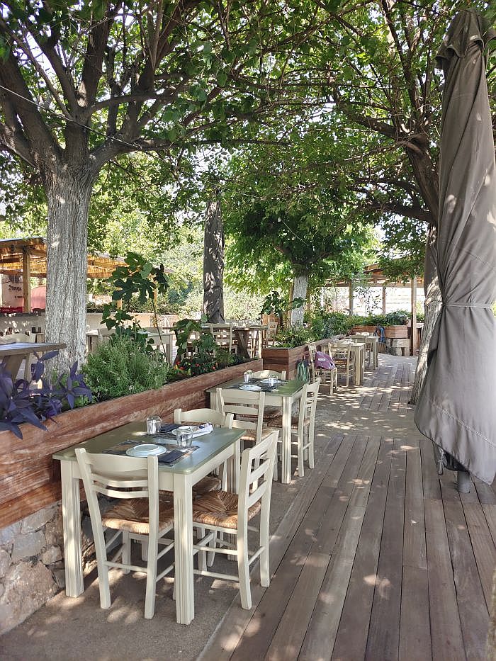 Je zde jen pár kaváren a taveren, ale všechny jsou prý vynikající. Je běžné zde vidět mořské želvy, které před tavernami žerou zbytky jídel - chodí před taverny rybářů. My jsme ten den také viděly dvě, jedna veliká plavala sem a tam kolem lidí.