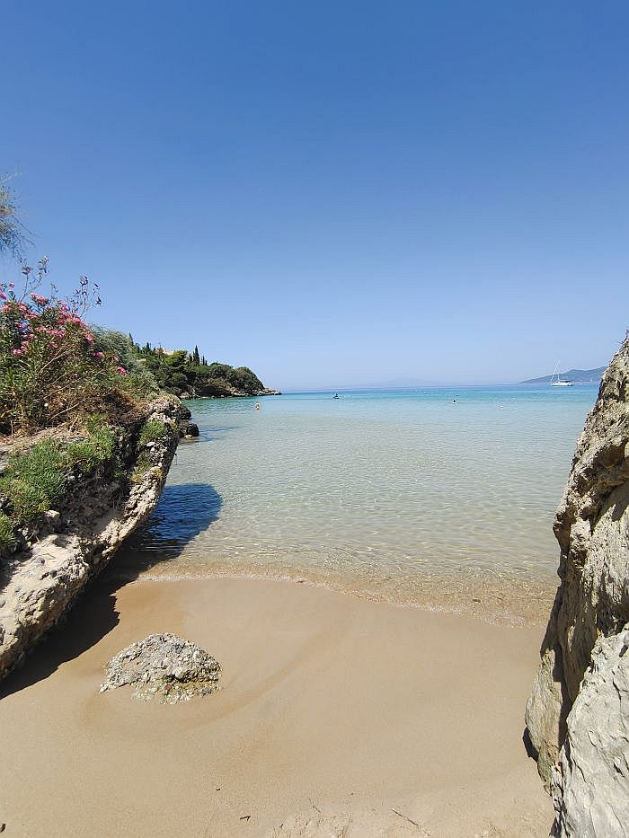 Dexameni - i když se nejedná o „pláž“ jako takovou, má plavecké plošiny, některé s žebříky, které vám pomohou dostat se do vody, je to pěkné místo. Moře je zde křišťálově čisté a máte pocit, že plavete v bazénu!