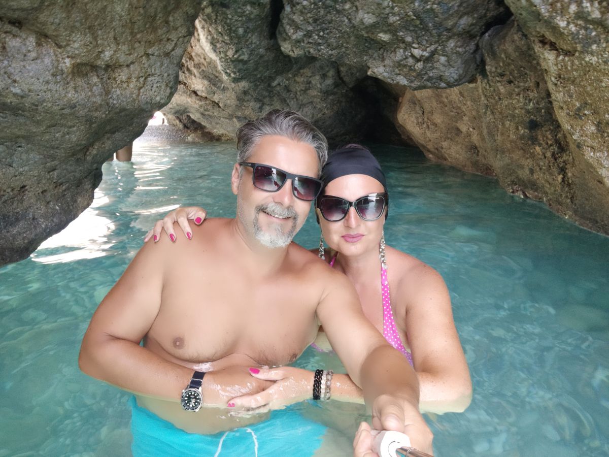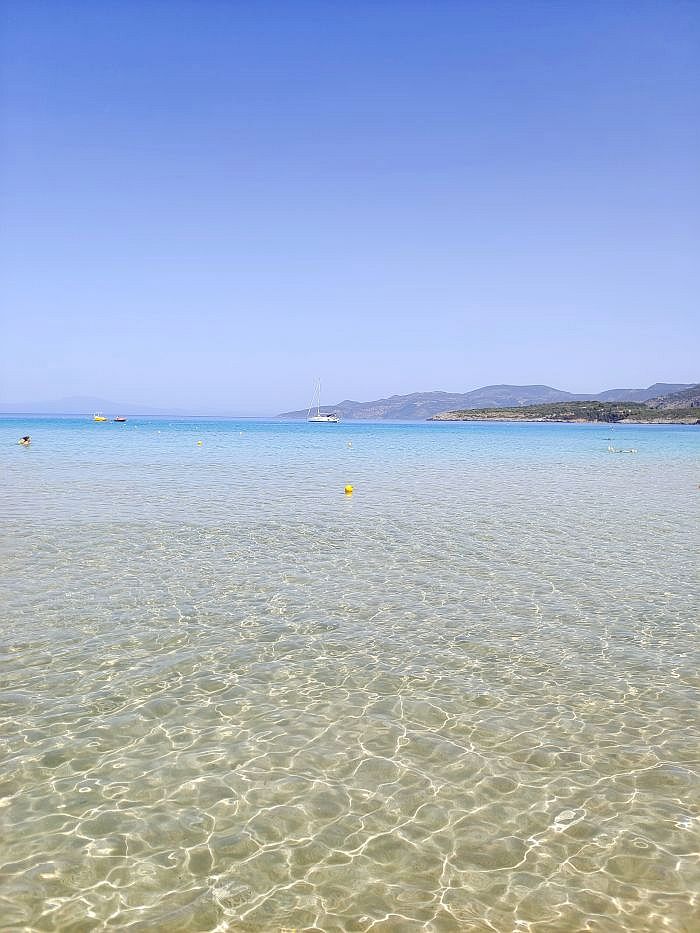 Je to prostorná zátoka s křišťálově tyrkysovou vodou a čistým světle zlatým jemným pískem. My jsme sem přijeli v den, kdy byl silnější vítr, a tak jsem ten jemný písek měla v jídle, zubech, vlasech, prostě všude :-D.