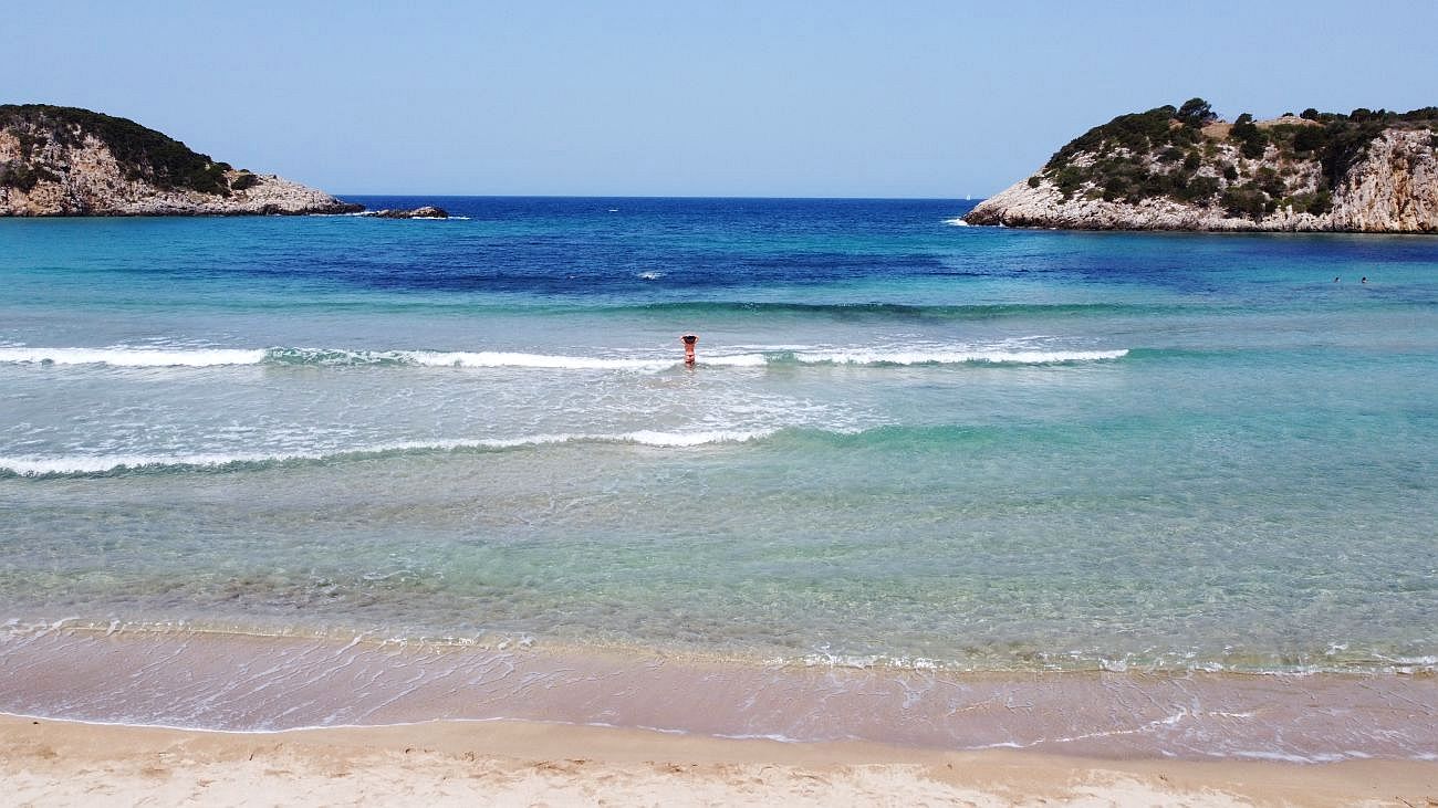 Příjemnou a překvapivou vlastností vody v Kalogrii jsou studené proudy. Hodnotíme ji oproti předchozím dnům jako pláž s chladnější vodou, ale nám to právě vyhovovalo.