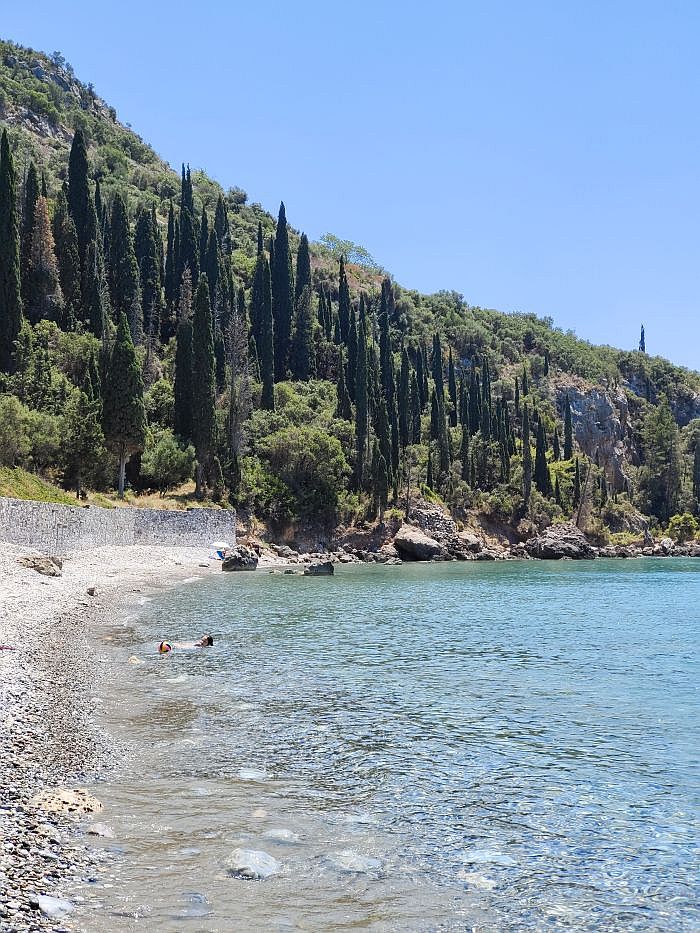 Místo nemá žádnou pláž, jen skály, kameny, nebo několik míst pod stromy, kde si můžete rozložit ručník, abyste si mohli sednout. V sezoně bývá přeplněné. Je lepší sem přijet ráno, abyste i zaparkovali. Parkovali jsme přímo nad pláží.