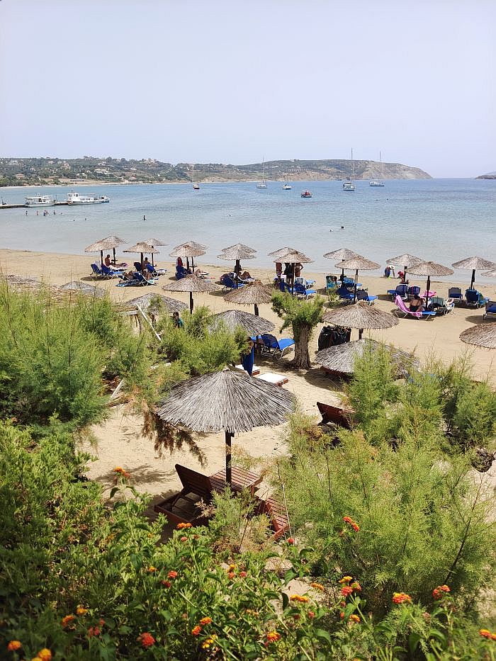Cestou z výletu jsme se ještě zastavili na pláži na večerní koupání. Vzhledem k času - bylo skoro 18 hodin, se fotky barevně moc nepovedly - slunce už výrazně kleslo, tak přináším jen pár informací. V úvodu pláže, která má nejvíce kamenů v moři, je úžasná restaurace Stoupa, kterou poznáte podle toho, že je na pláži jediná zarostlá mnoha krásnými stromy. Lehátka se pod ní pronajímají za 10 € (set + slunečník). Točené pivo bylo fajn, frappe taky, sedět přitom nad mořem a koukat na něj, je příjemné ...