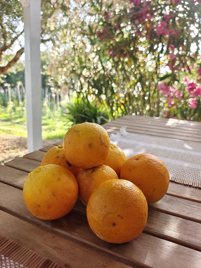 Na jídelním stole, u kterého stojí 2 židle, na nás první den čekaly pomeranče, pěstovaného čistě, velice osvěžující chutě. Další den jsme dostali něco jiného. Návrat od moře byl tedy velice milý.
