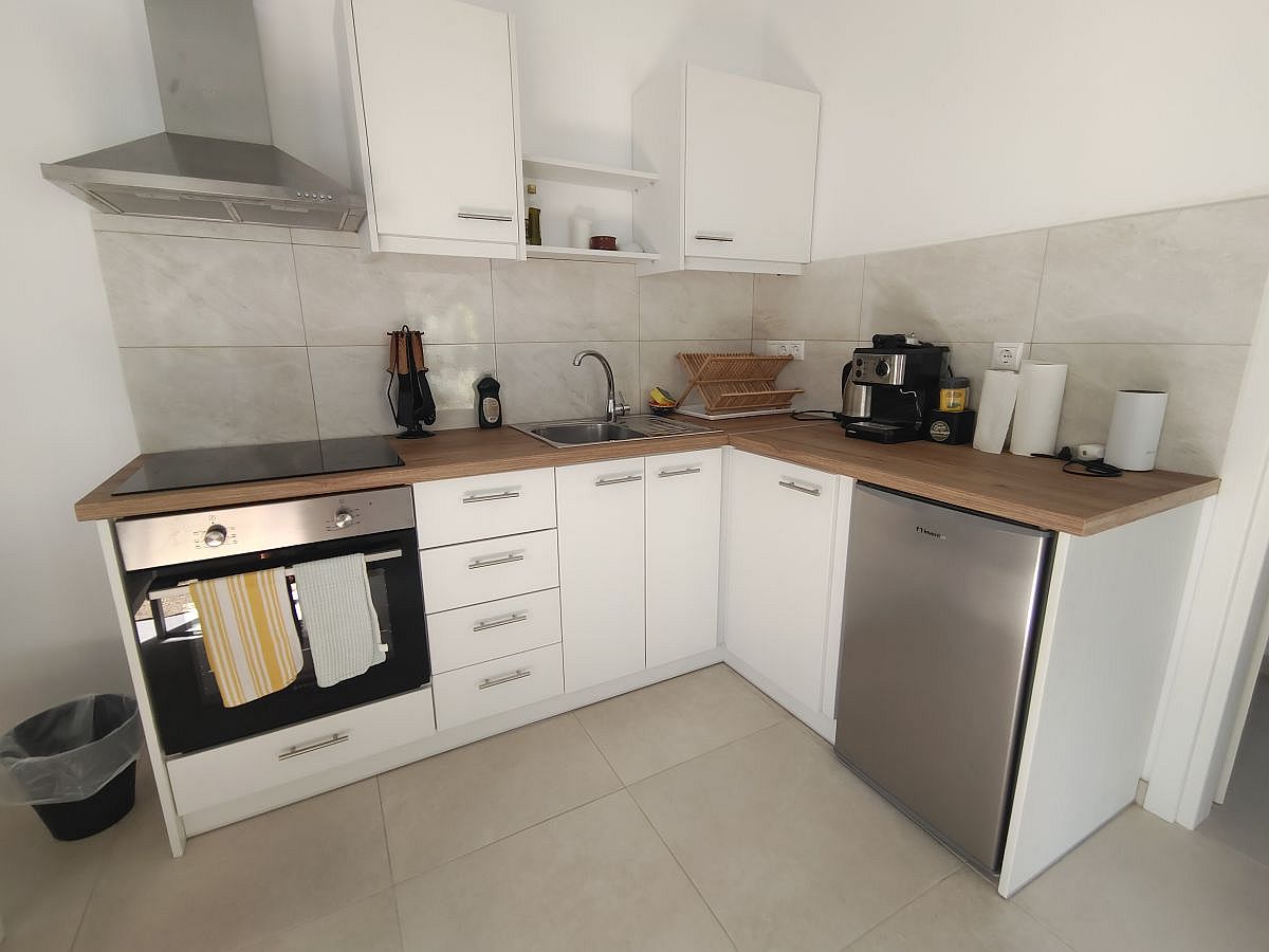 Kuchyně je plně vybavená, má troubu s digestoří, kávovar, rychlovarnou konvici, mnoho nádobí a pomůcek na vaření, nabízí sůl, pepř a olivový olej. Malá lednice s jednou mrazící plochou pro 2 lidi stačí.