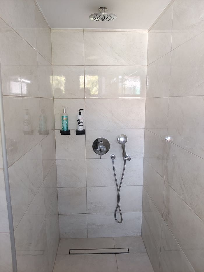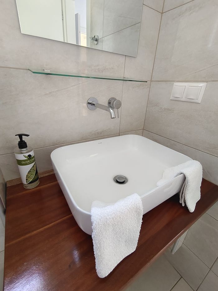 Koupelna se sprchou je vybavená potřebnými pomůckami, připravený byl pro nás sprchový gel a šampon, olivové tekuté mýdlo na ruce (vše ECO friendly), k dispozici byl fén, WC papír, ručníky a osušky.