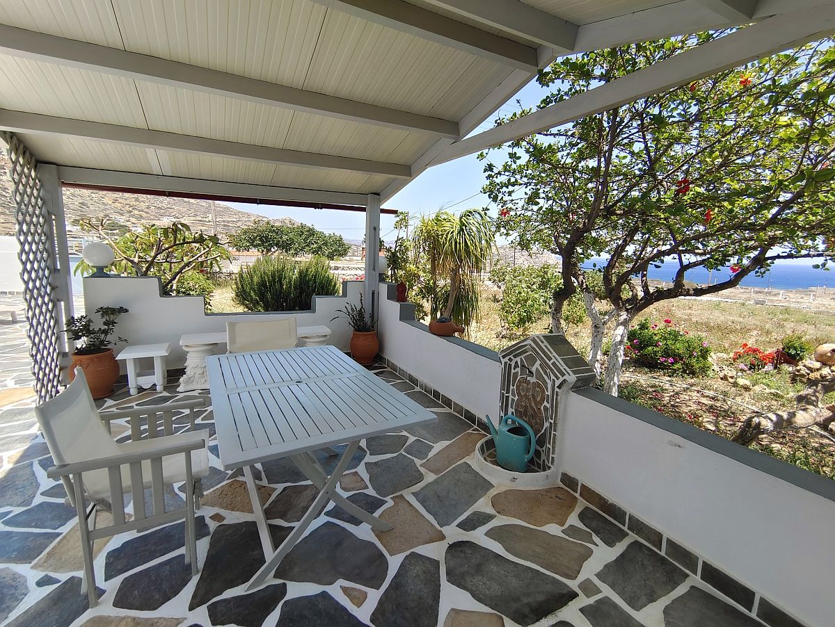Před domem je prostorná terasa s výhledem na moře, v okolí terasy jsou keře, květiny, malé stromy a byliny. Stojí zde pergola, pod ní je stůl a židle.